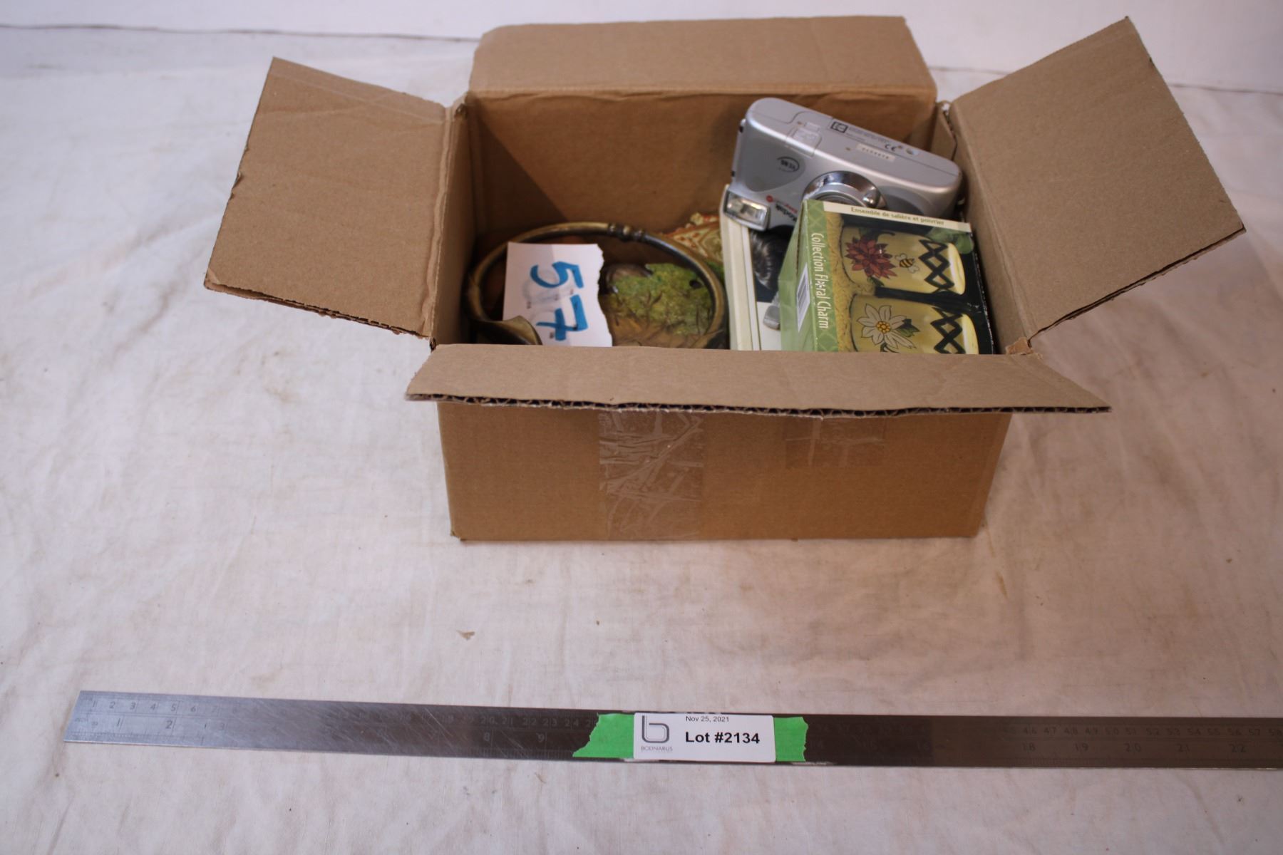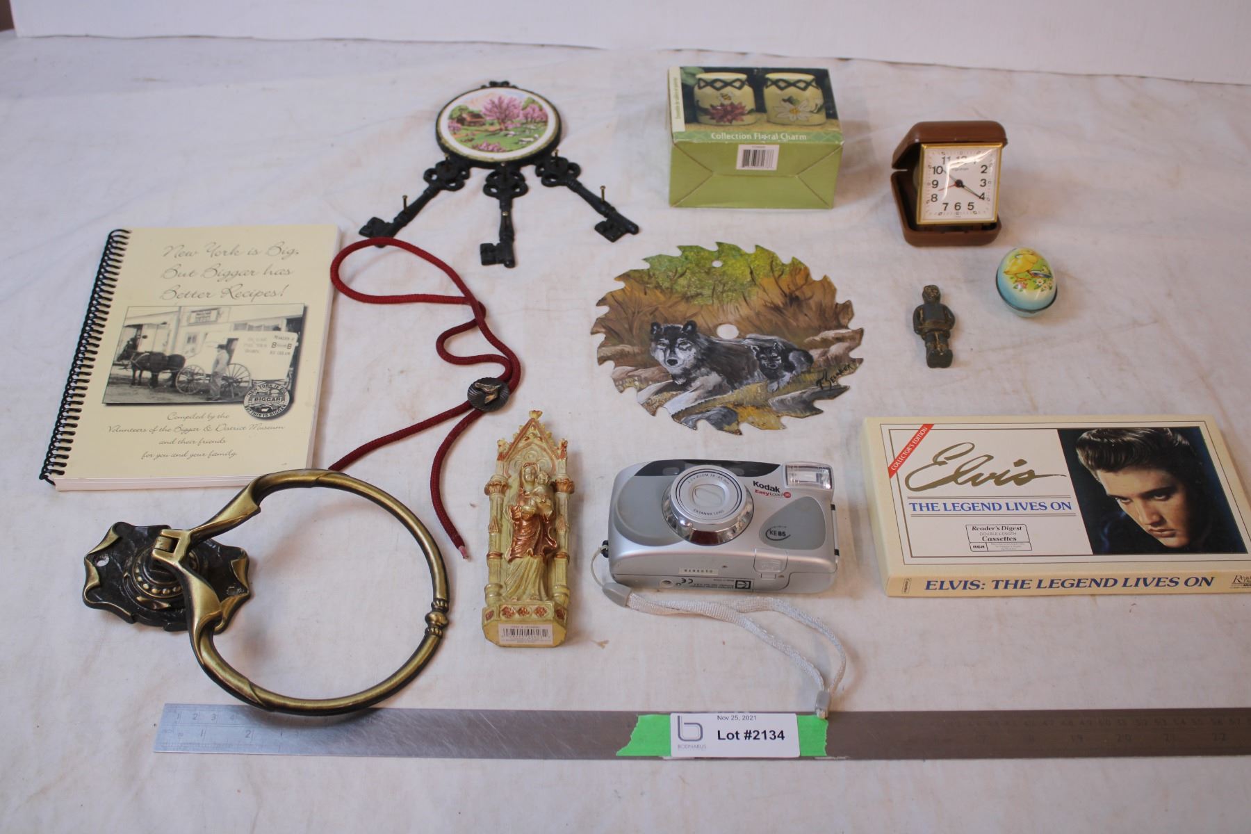 Elvis casettes, brass knocker, travel clock, bolo tie, painted saw blade, etc