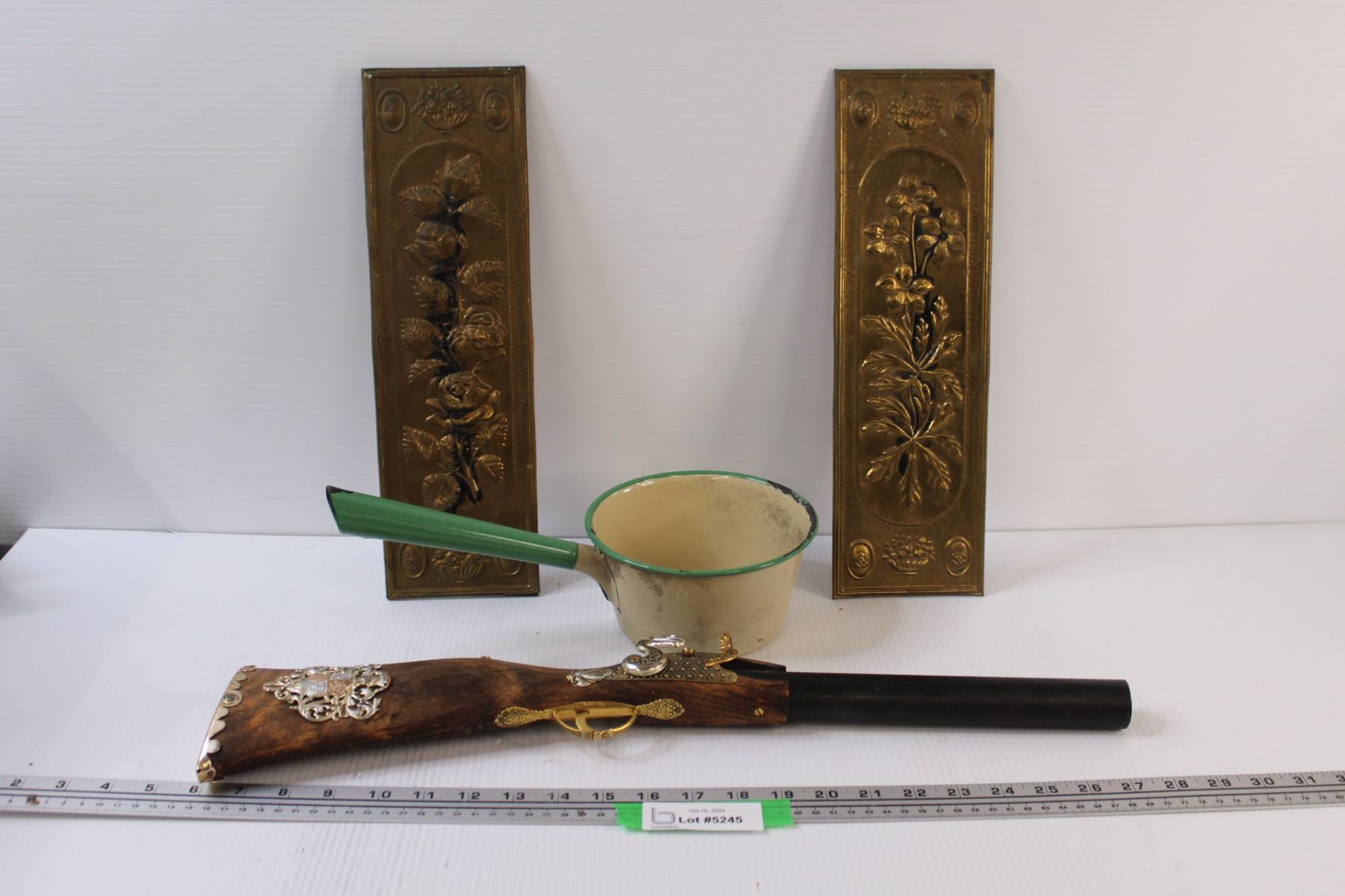Enamel Pot & (2) Pressed Metal Wall Art & Toy Replica Pirate Muzzle Loader Rifle