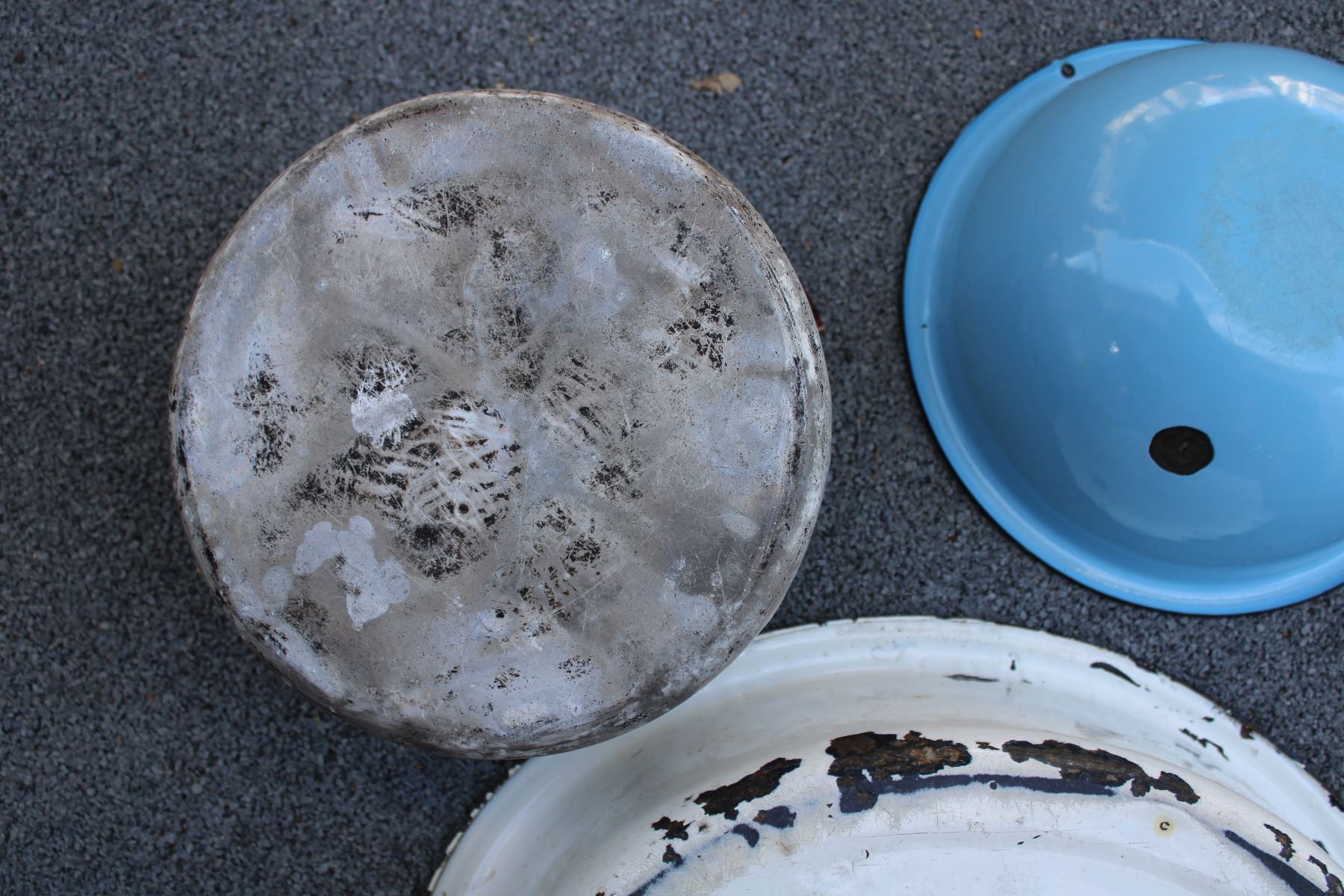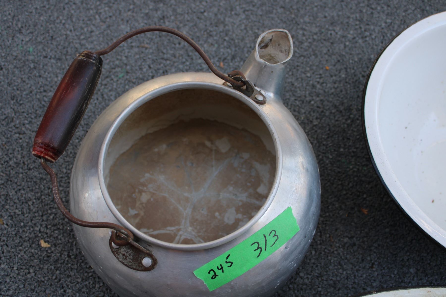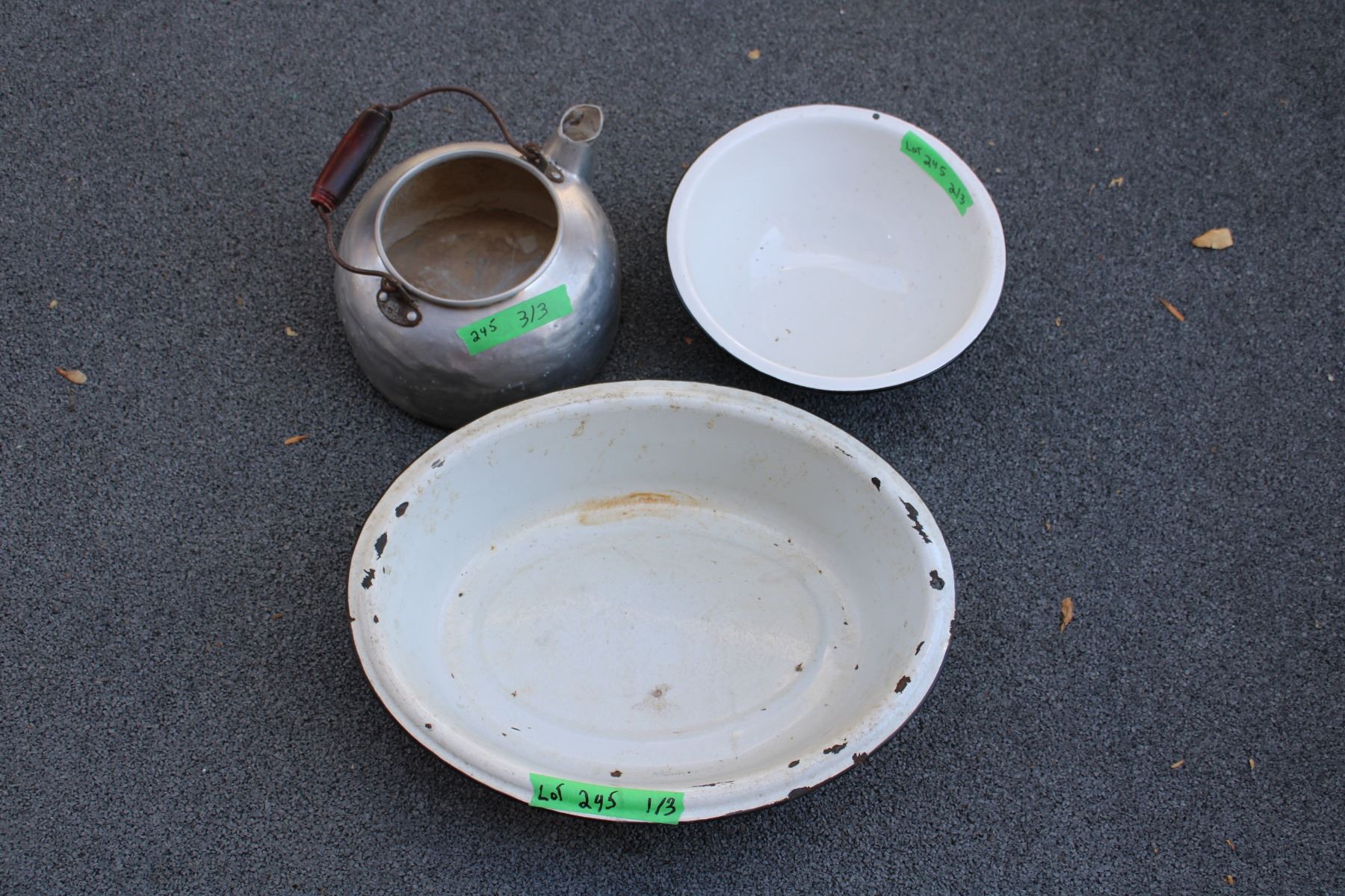 Enamel bowl (11" dia), wash tub (18x14) + aluminum kettle