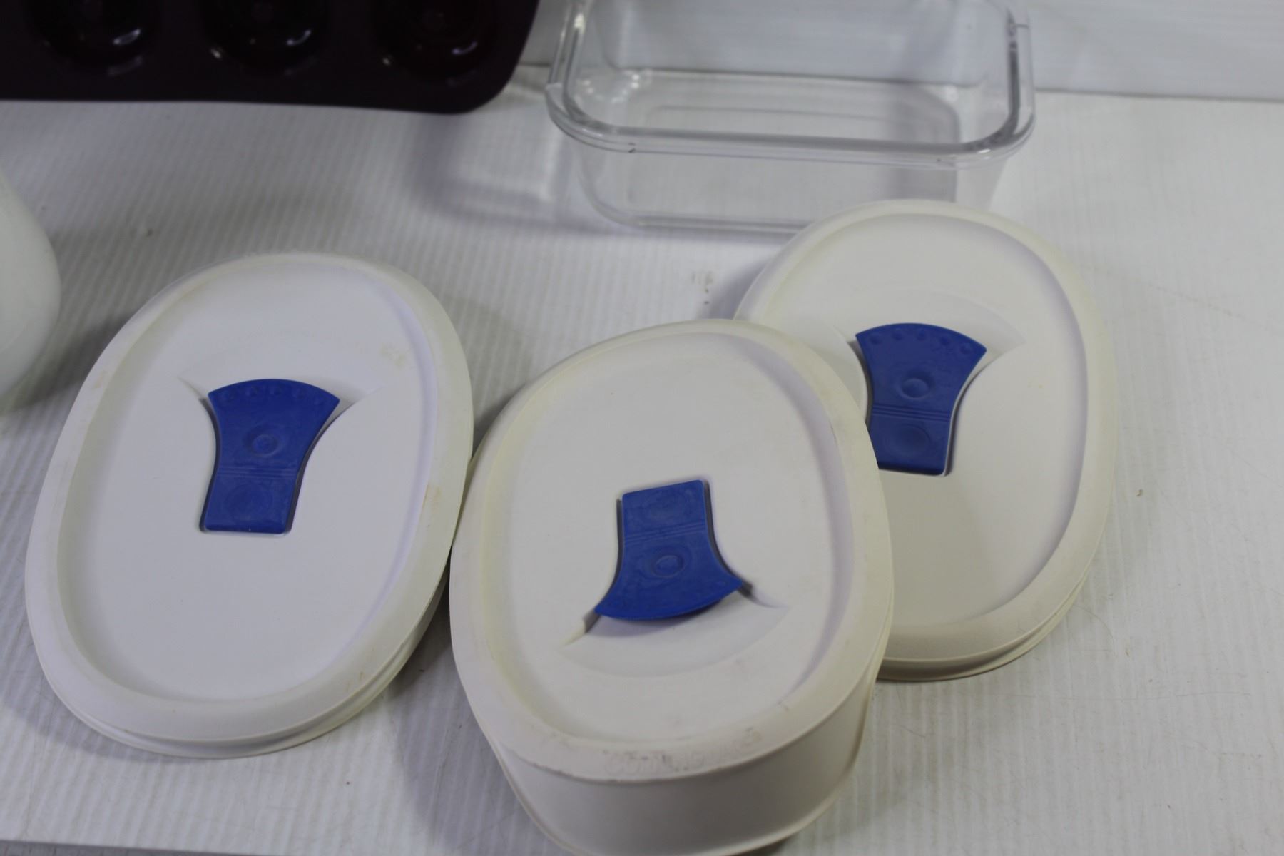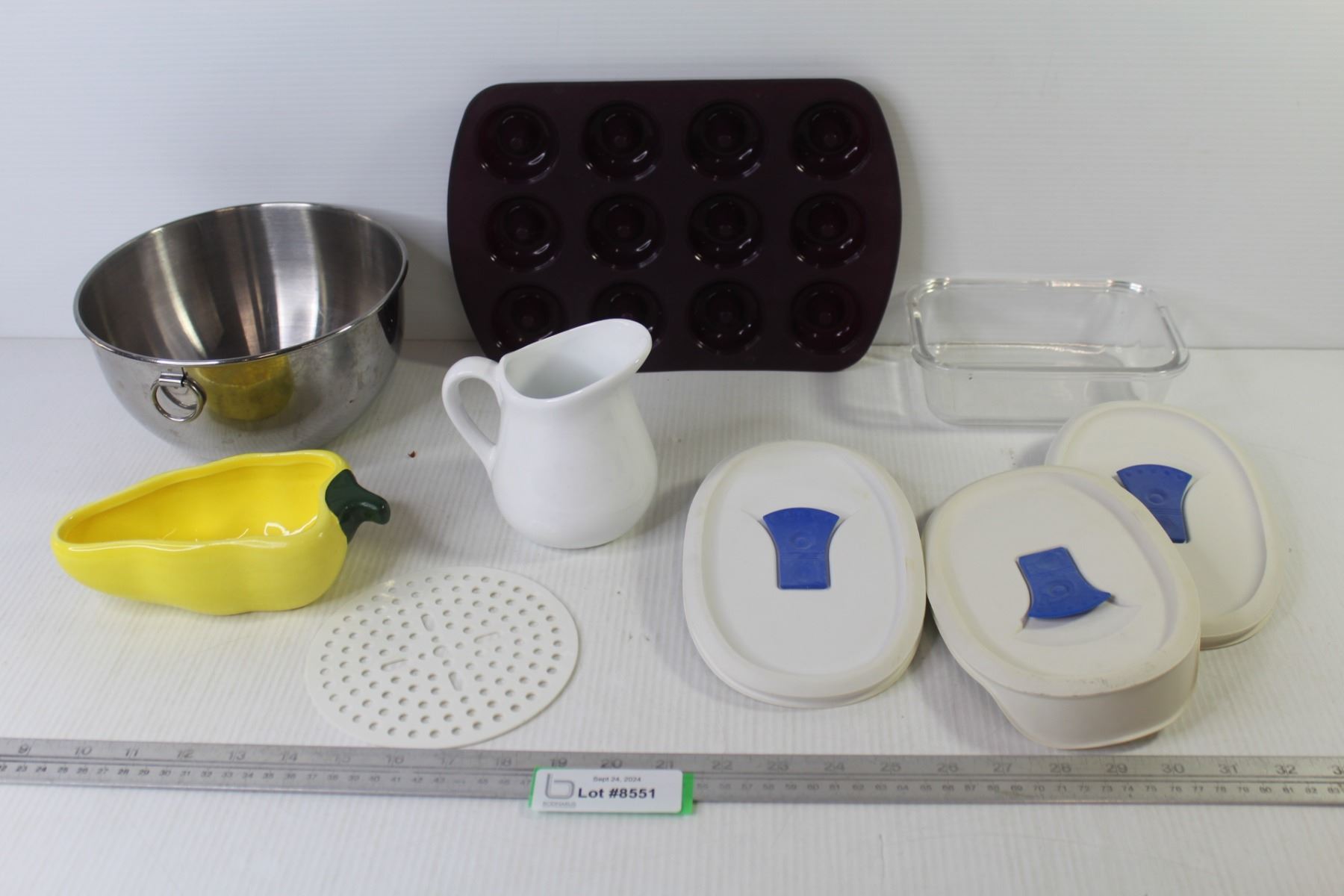 Epicure Brand Donut Maker - Plastic Lids - Glass Food Container - Stainless Steel Bowl - Ceramic Pepper Dish - Ceramic Creamer