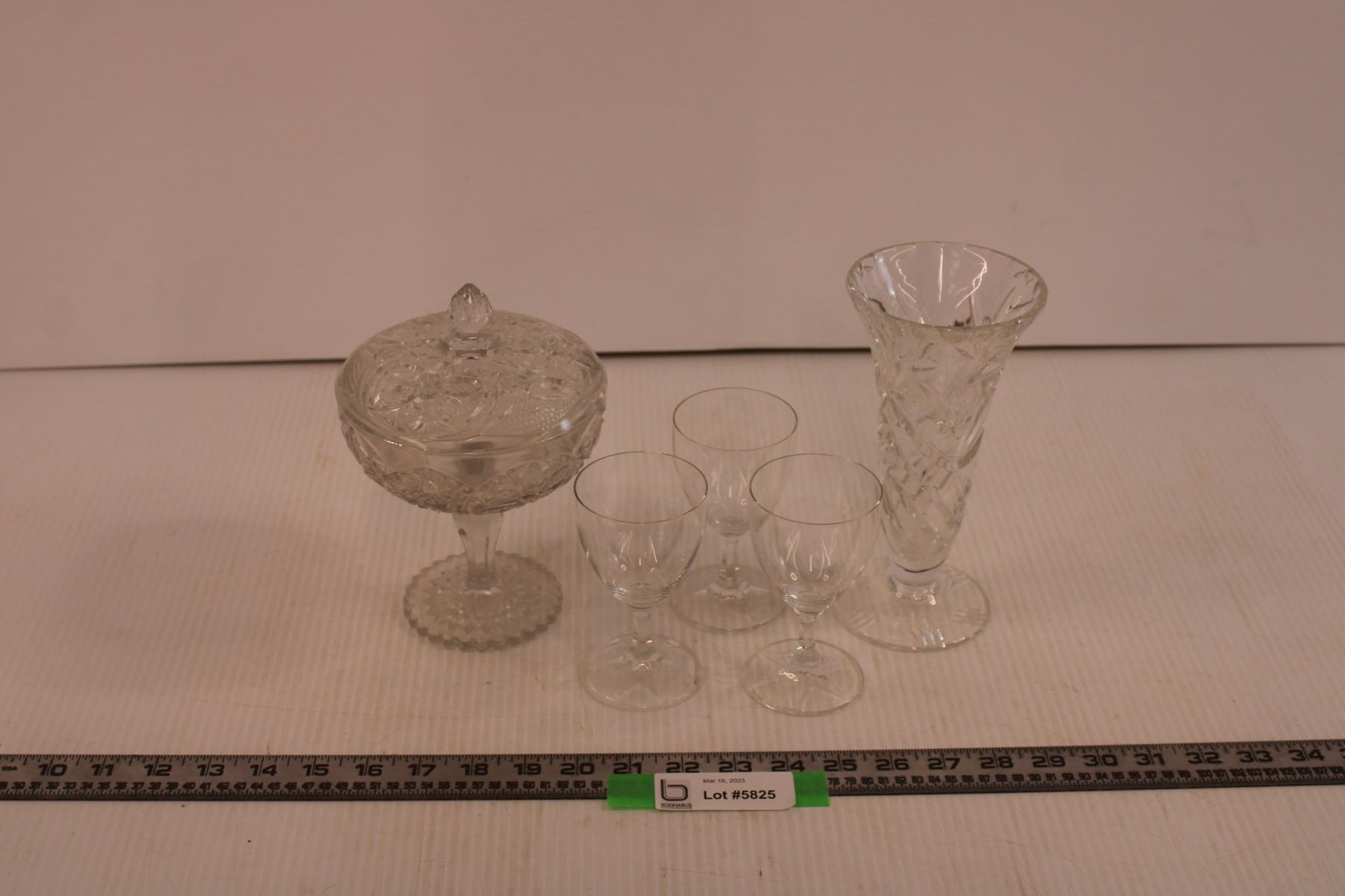 Etched Crystal Vase + (3) Desert Glasses & Candy Dish