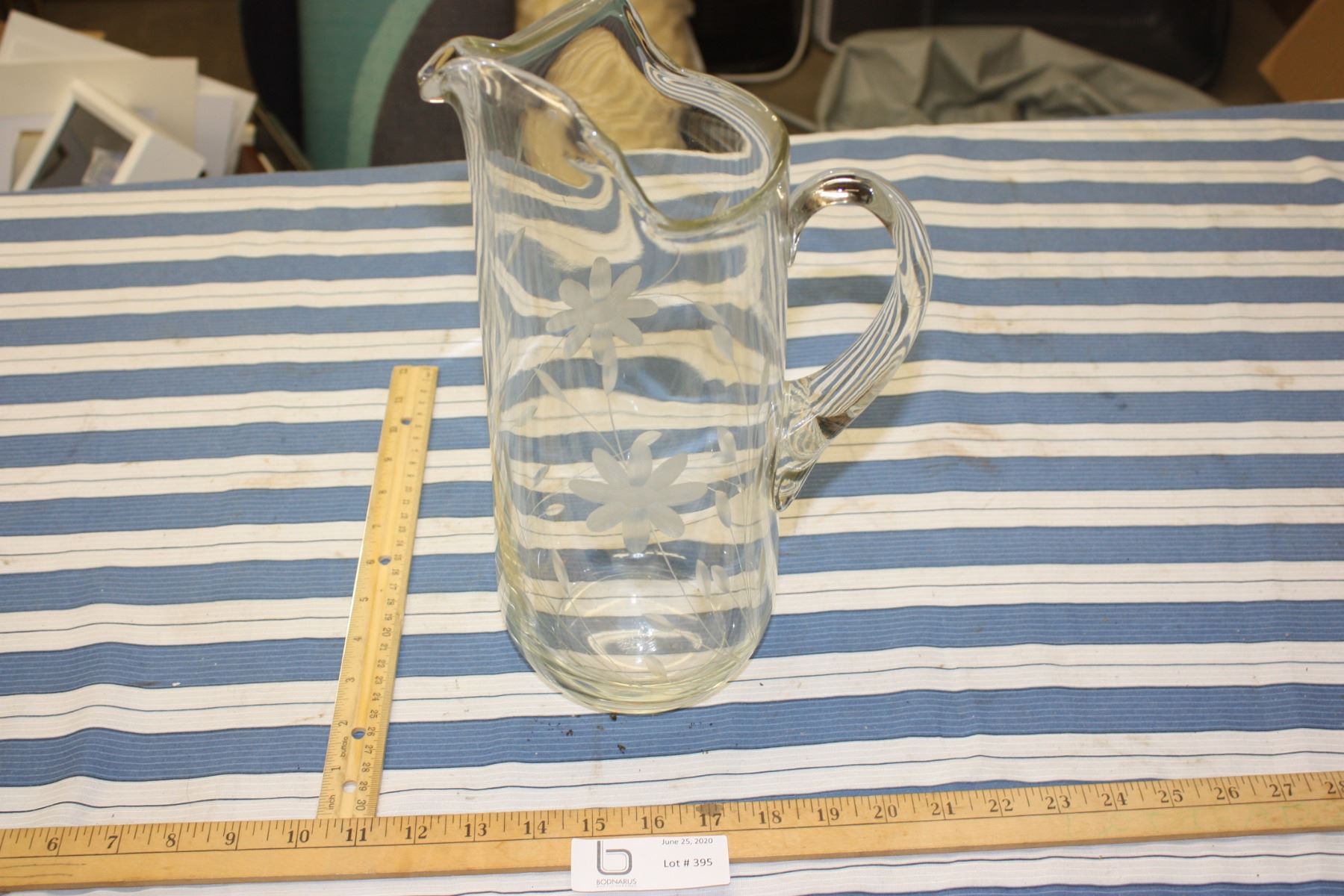 Etched Glass Pitcher 13" T