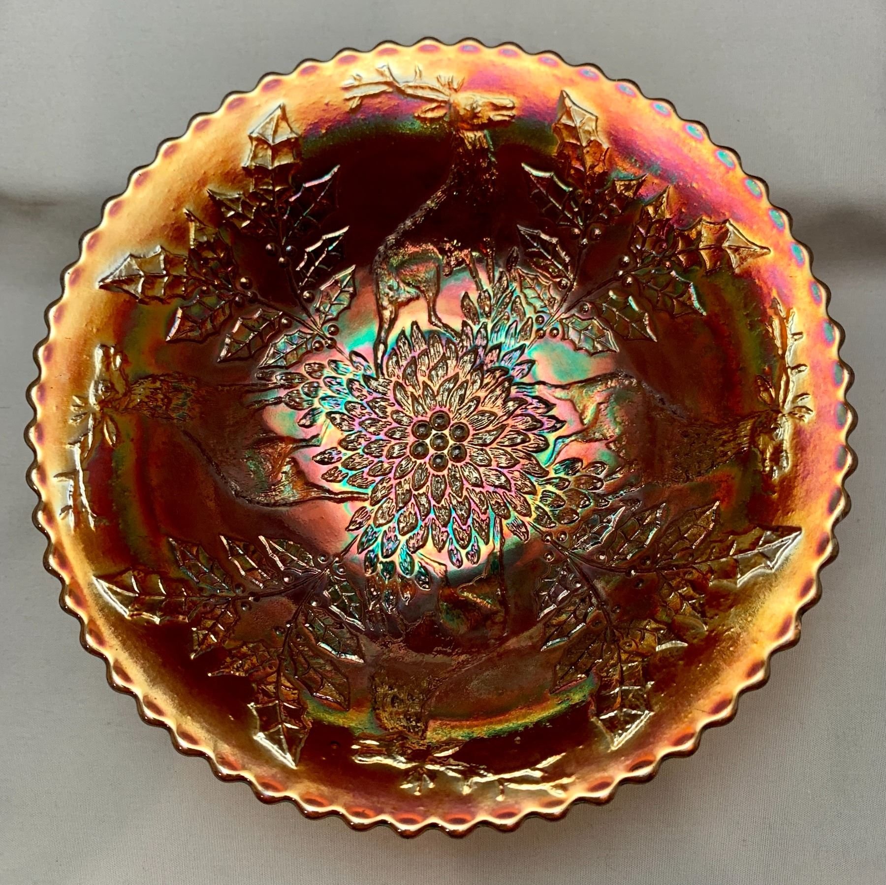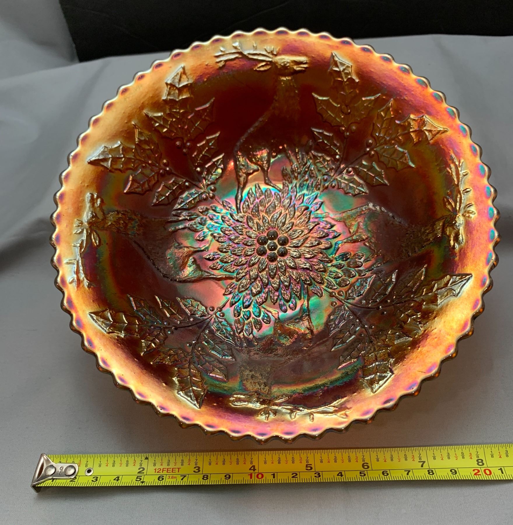 Fenton Amethyst “Stag & Holly” Carnival Glass Round Flared & Footed 8” Bowl - Very rare!