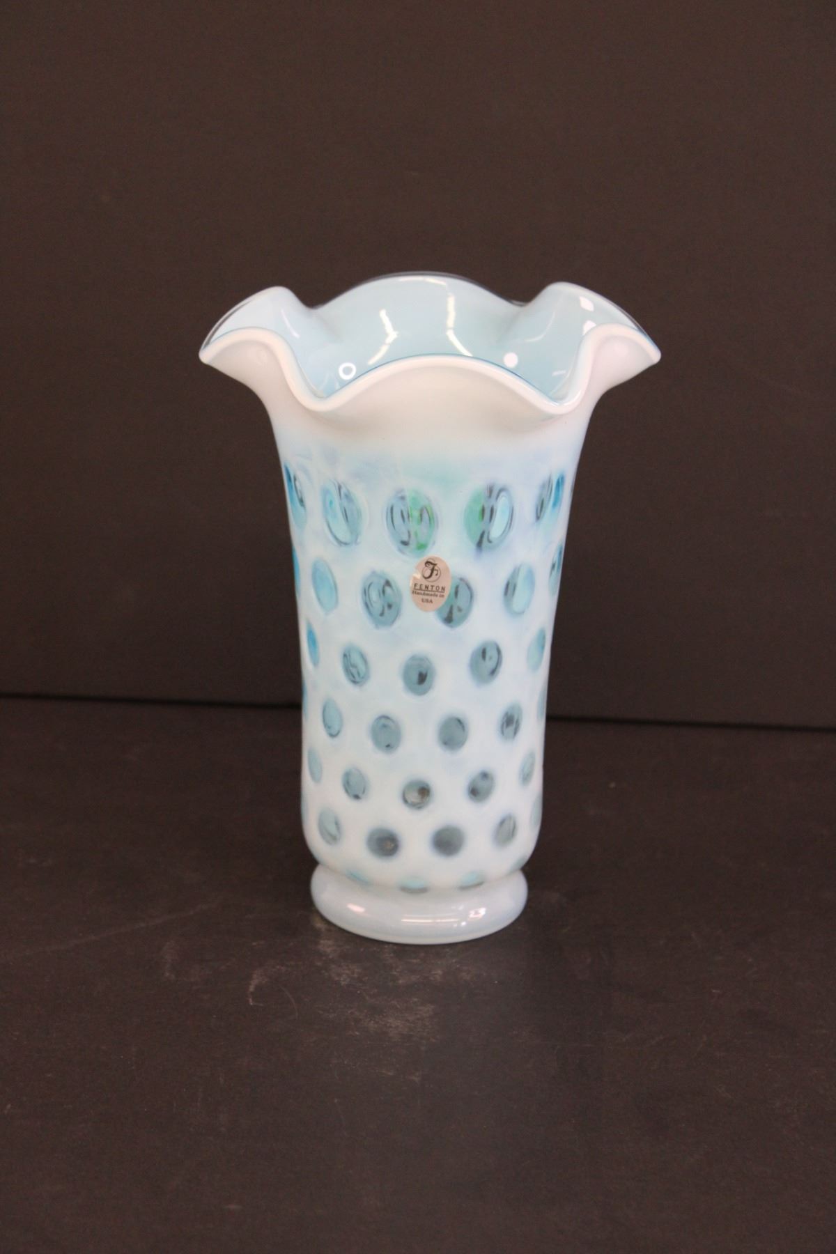 Fenton Blue Frosted Glass Controlled Bubble Satin Vase Ruffled (8" x 5 3/4")