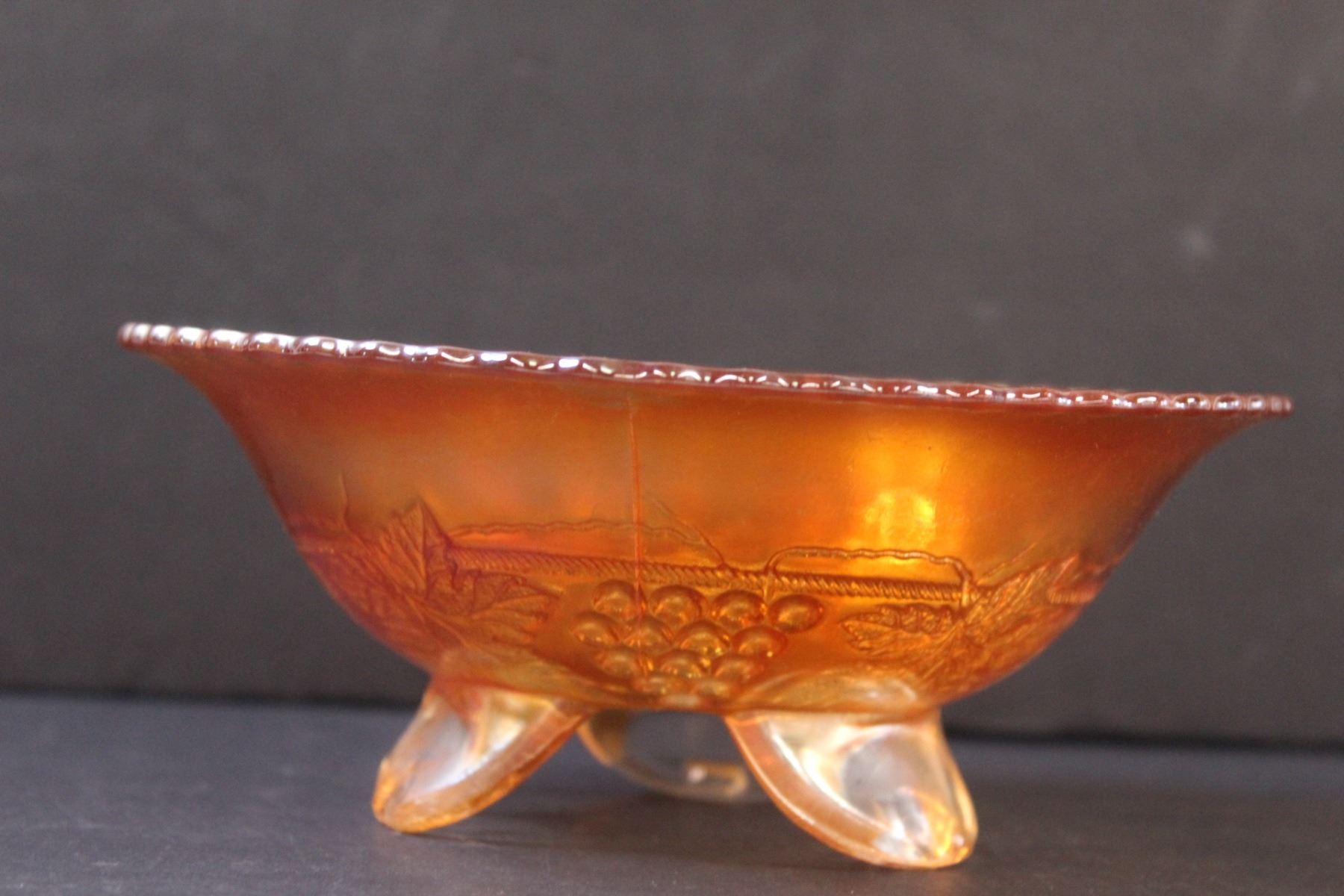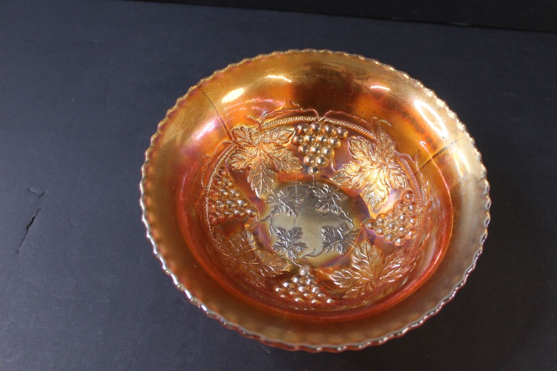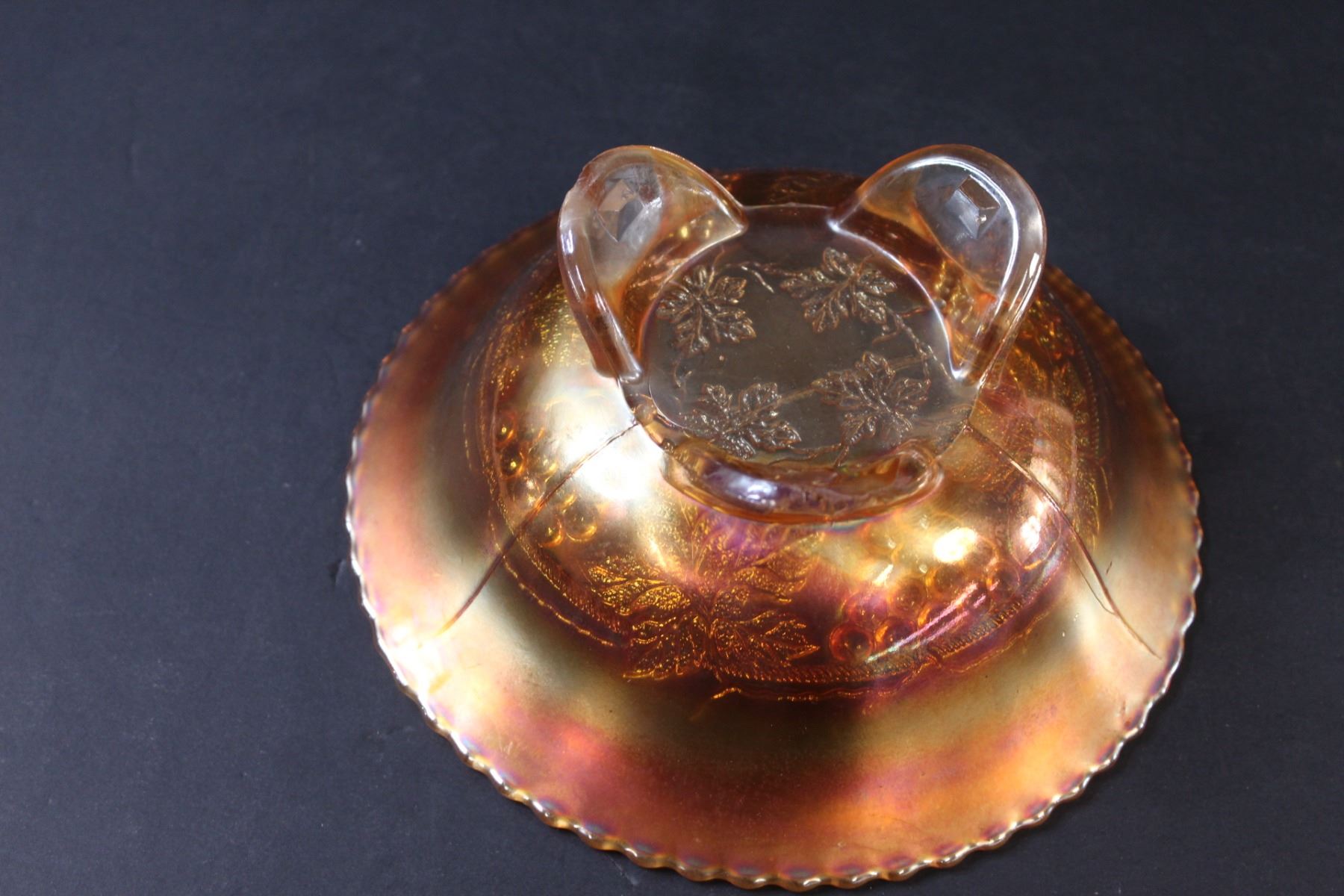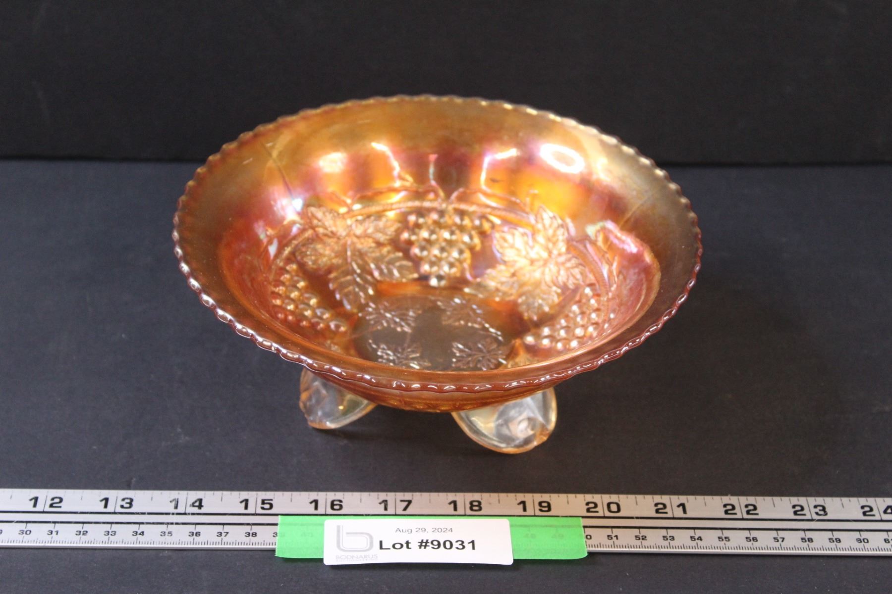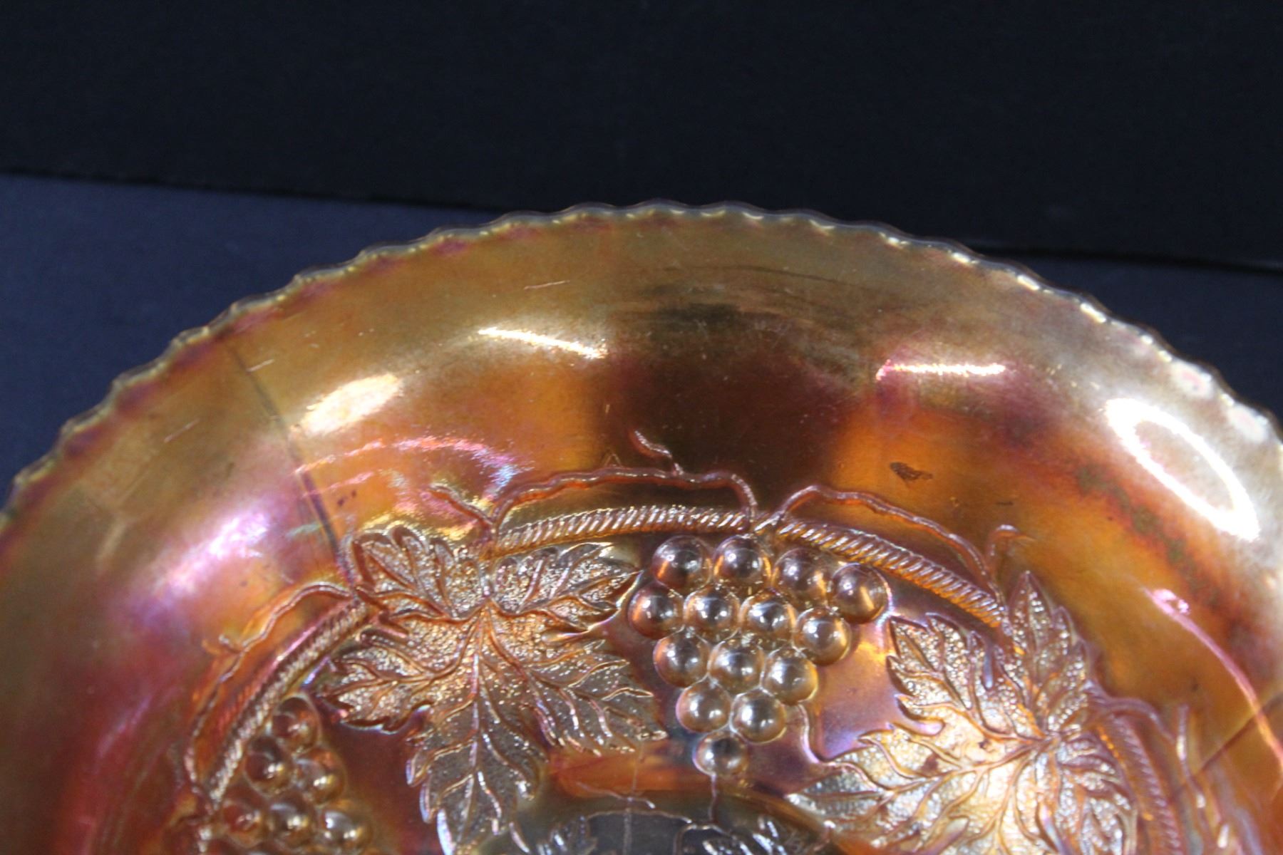Fenton Marigold Carnival Glass Leaf & Grape Footed Bowl - 8" x 3"