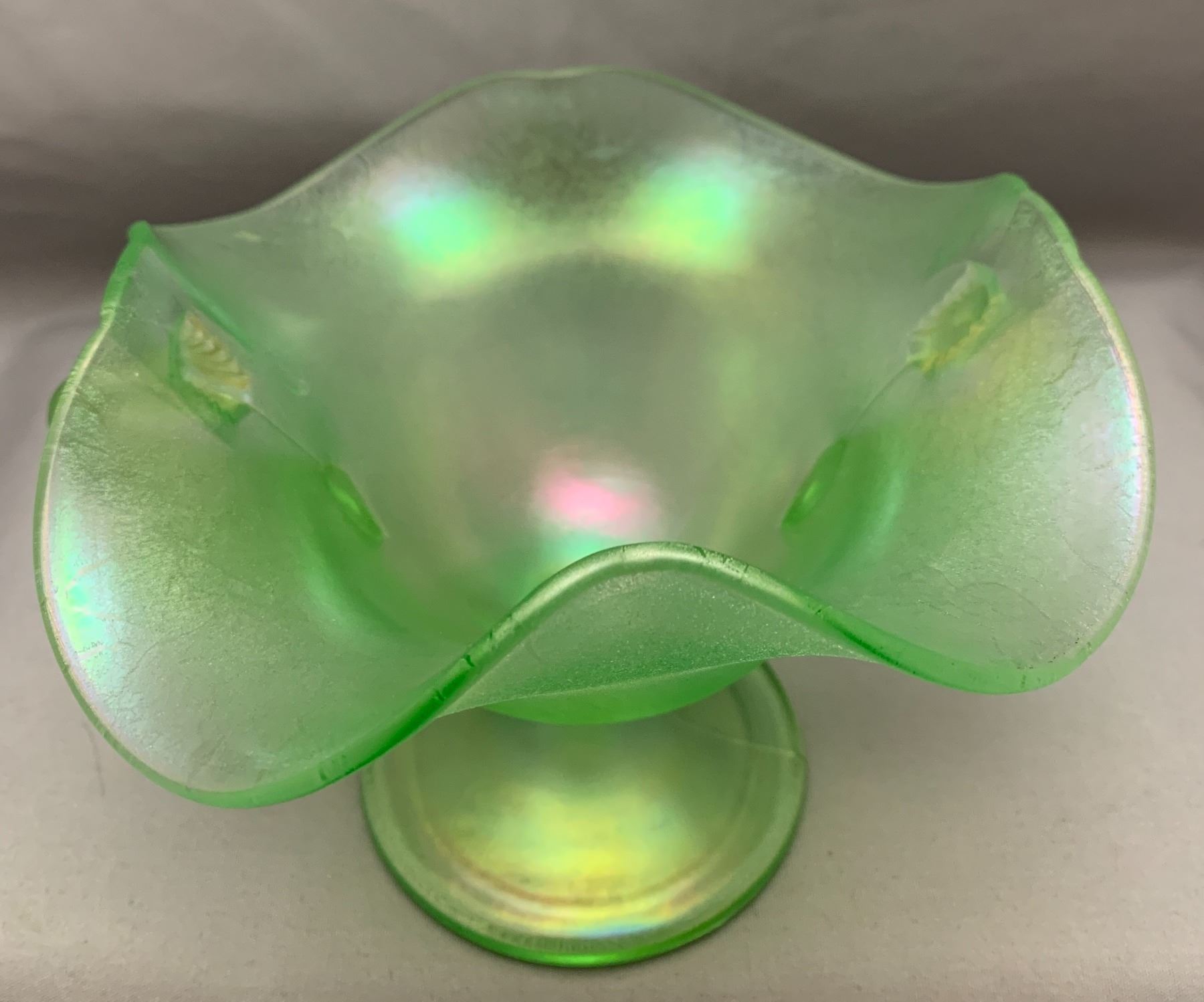 Fenton Uranium/Ice Green Glass "Double Dolphins" Stemmed Ruffled Candy Dish Circa 1920