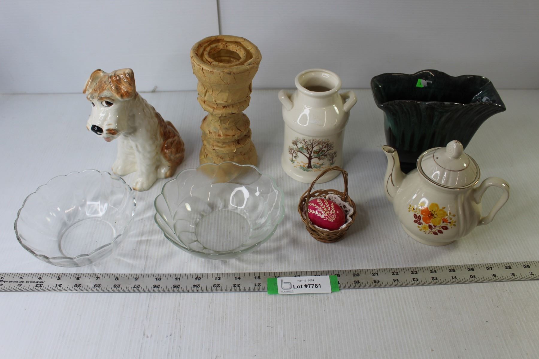 Festival Teapot, (2) Vases, Candle, Dog Ornament, Misc.