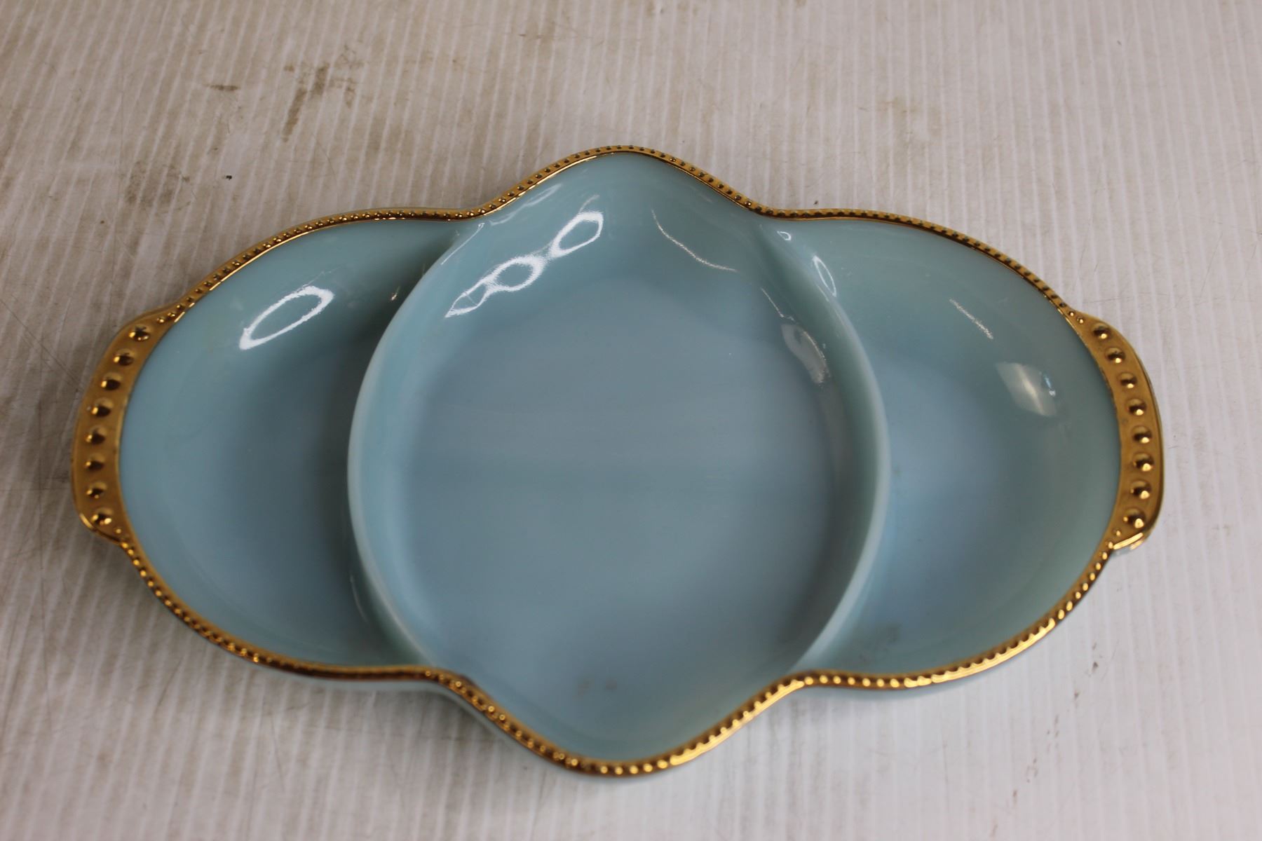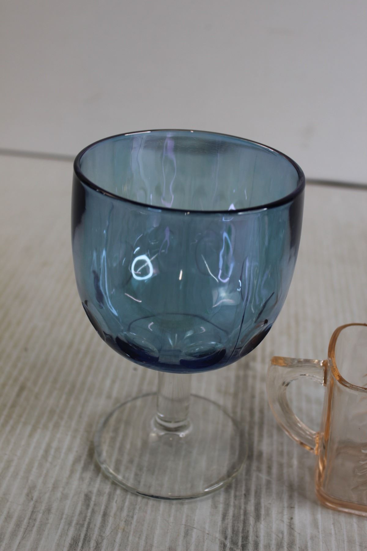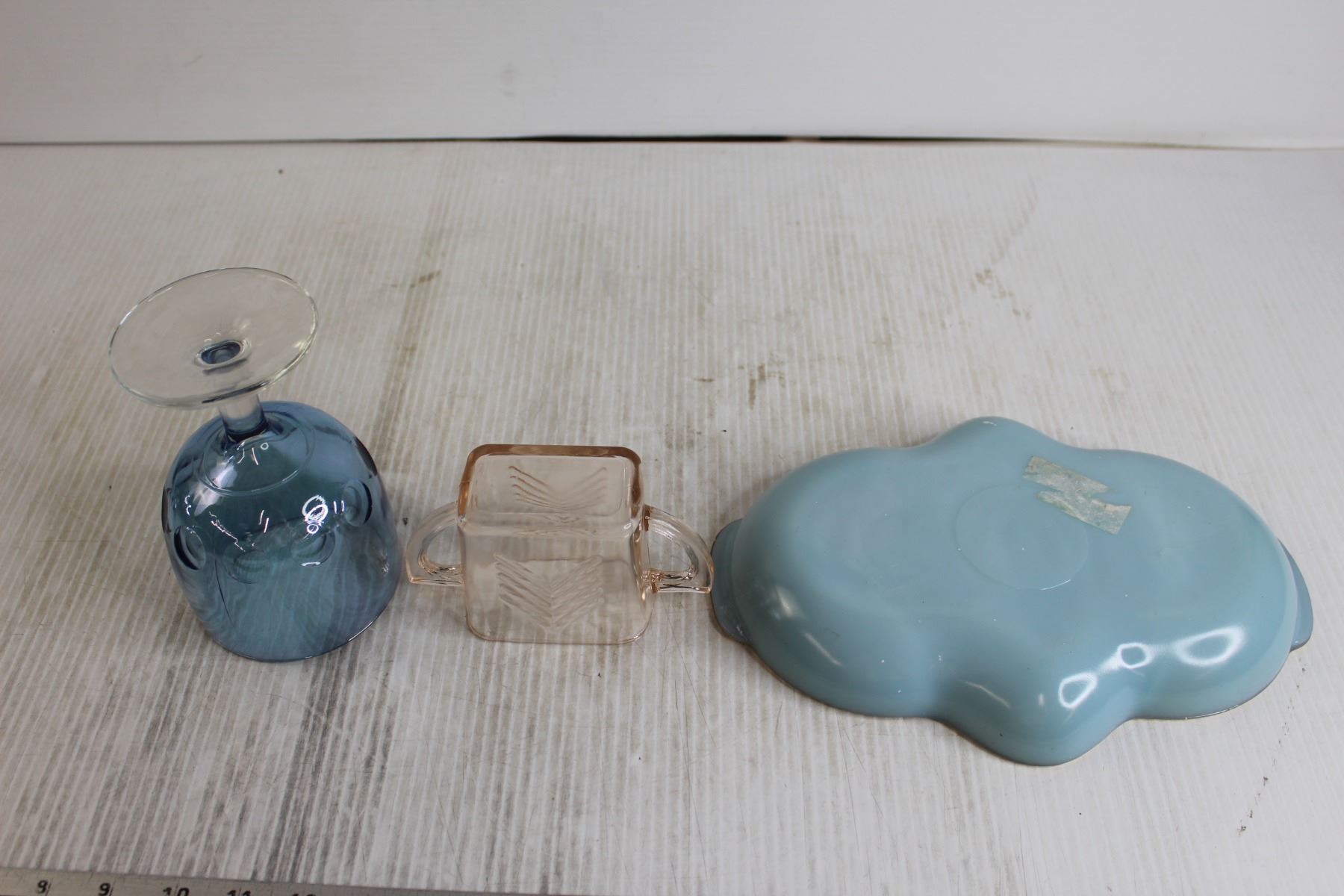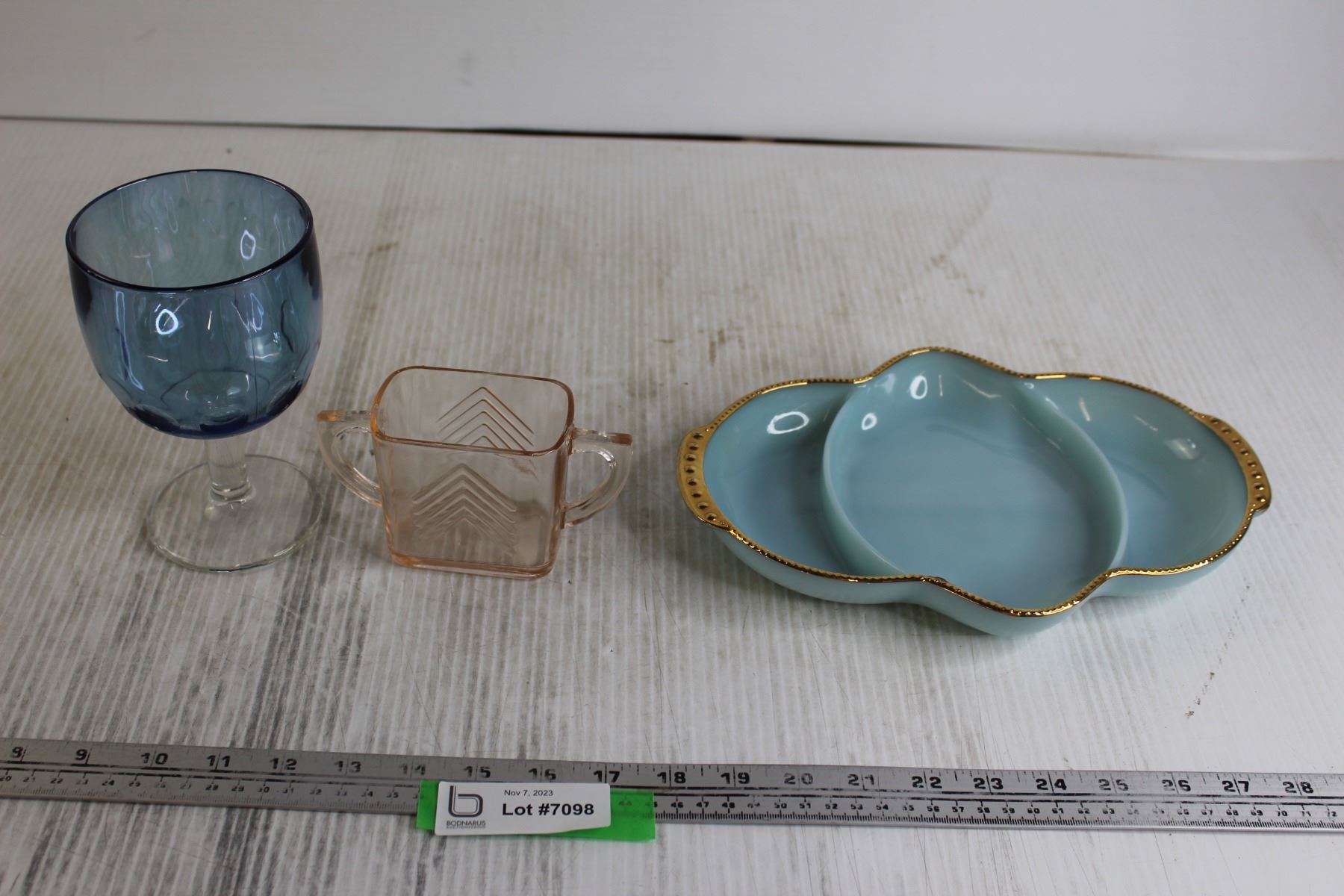 Fire King Delphite Blue Divided Dish, Pink Depression Glass Sugar Holder, Blue Goblet