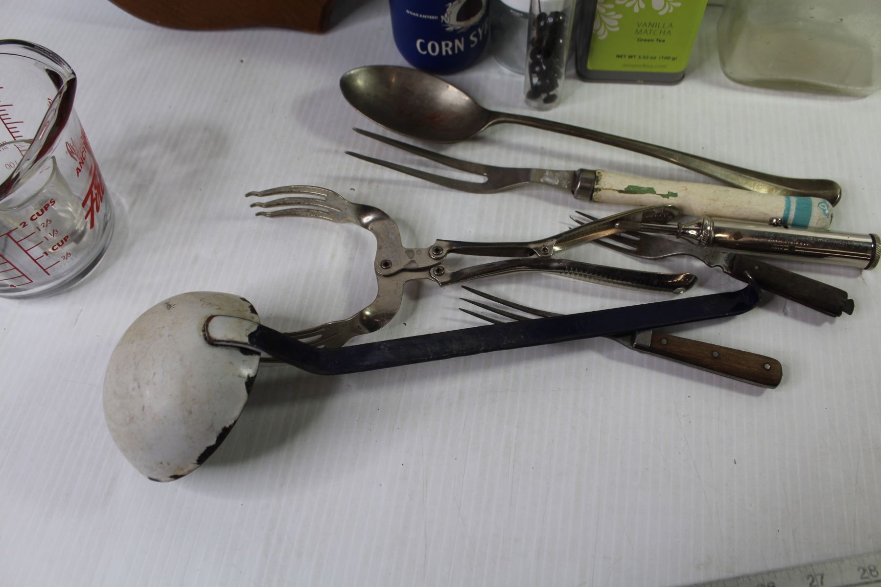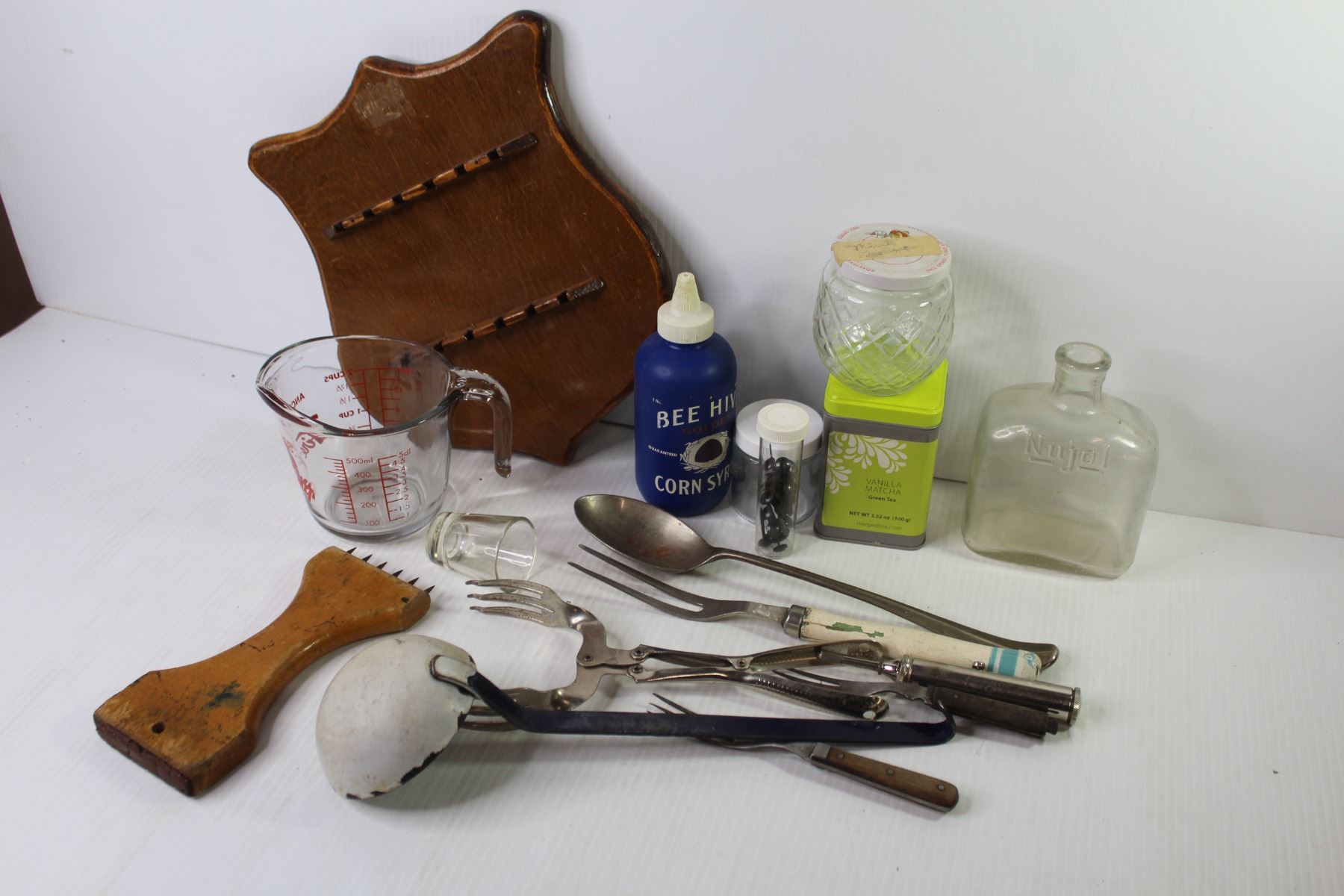 Fire King Measuring Cup - Upholstery Webbing Stretcher - Vintage Nujol Bottle - Collector Spoon Holder - Misc. Kitchen Ware Items