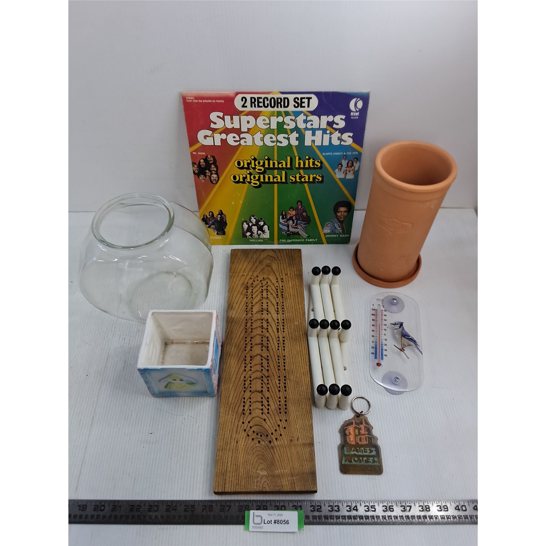 Fish Bowl, Crib Board, Earthenware Wine Cooler, Mixed Record Set, Wall Hanger, Misc.