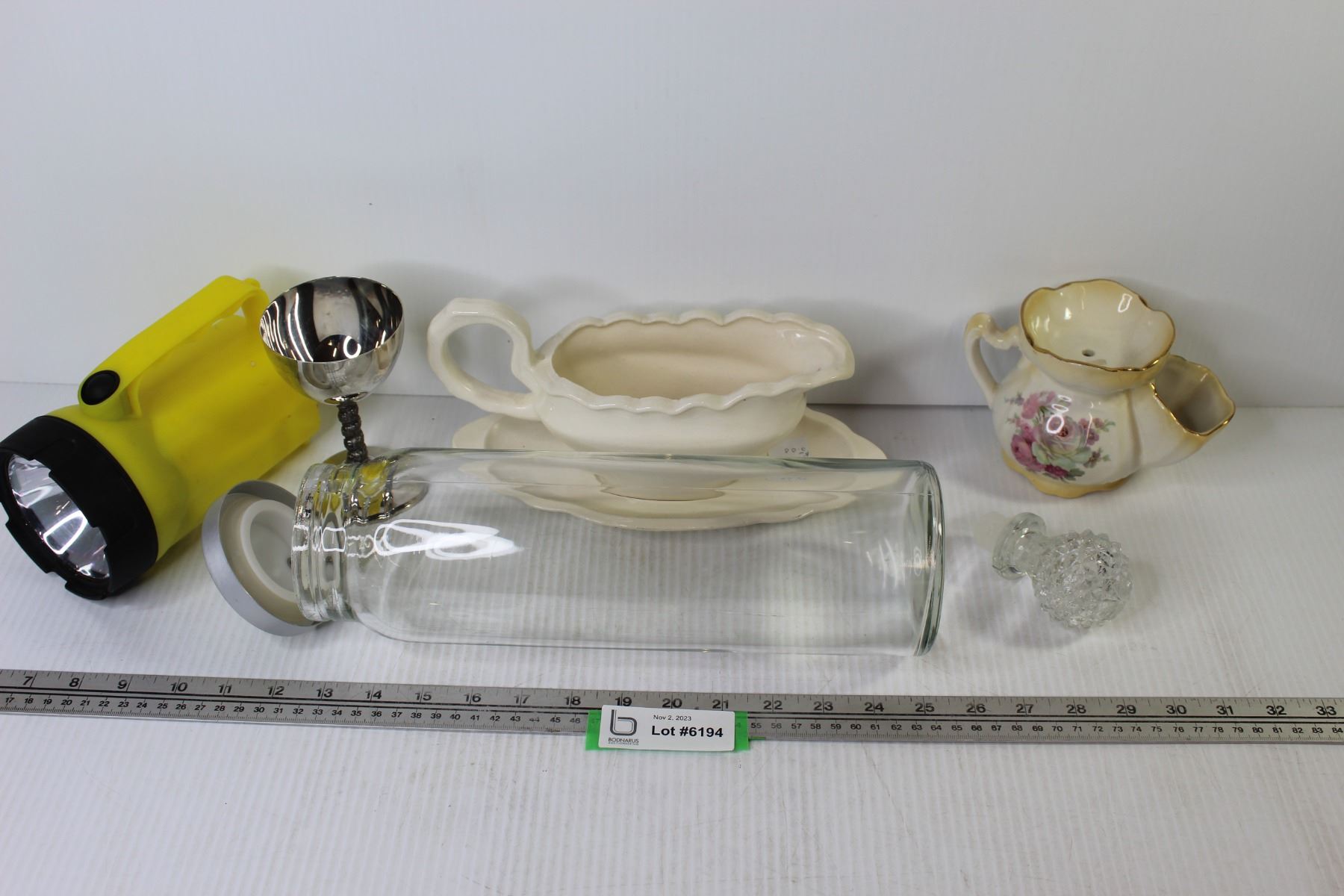 Flashlight - Vintage Shaving Cup - Gravy Boat w/Tray - Plated Goblet - Tall Jar w/Lid - Decanter Top