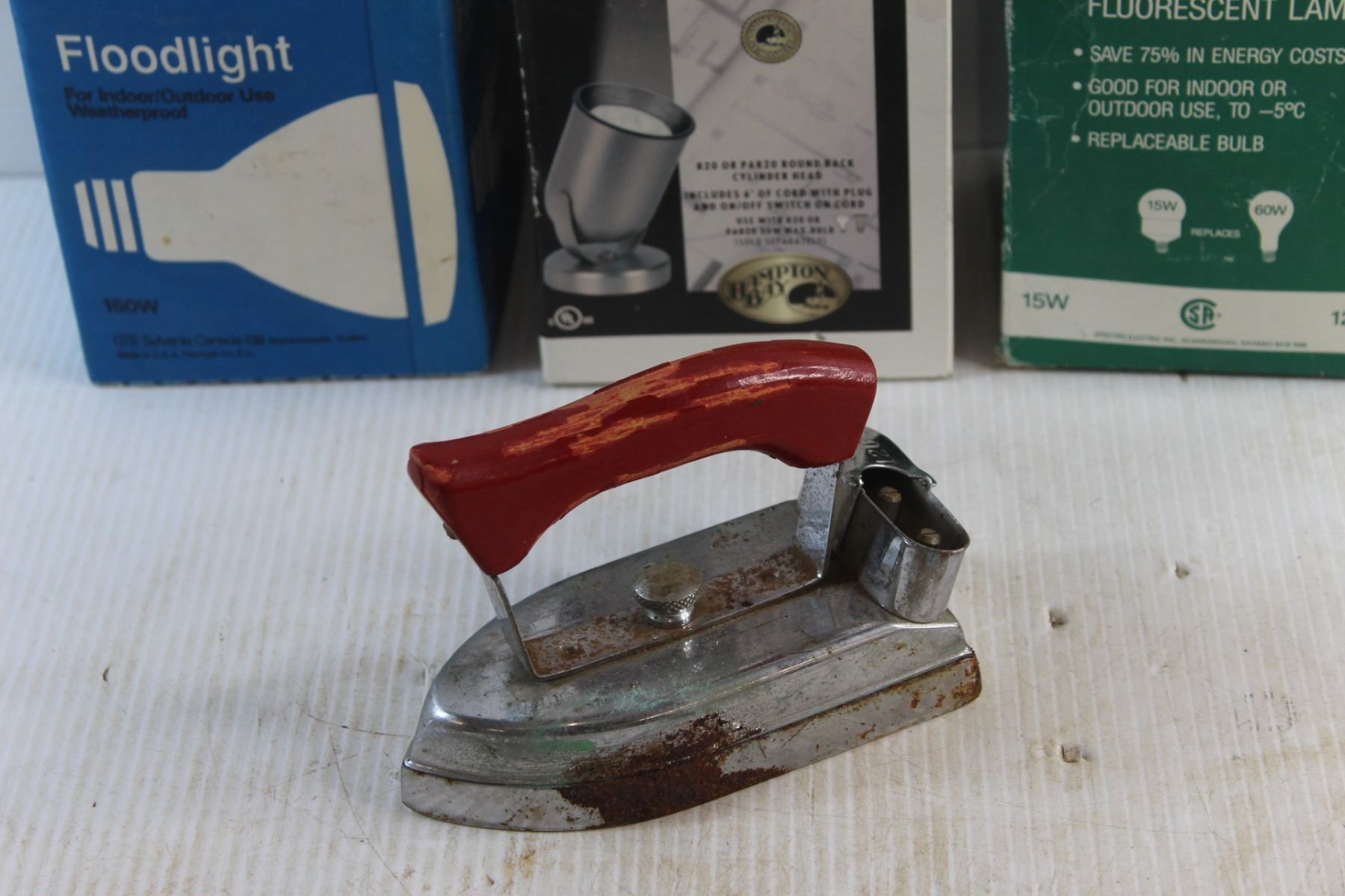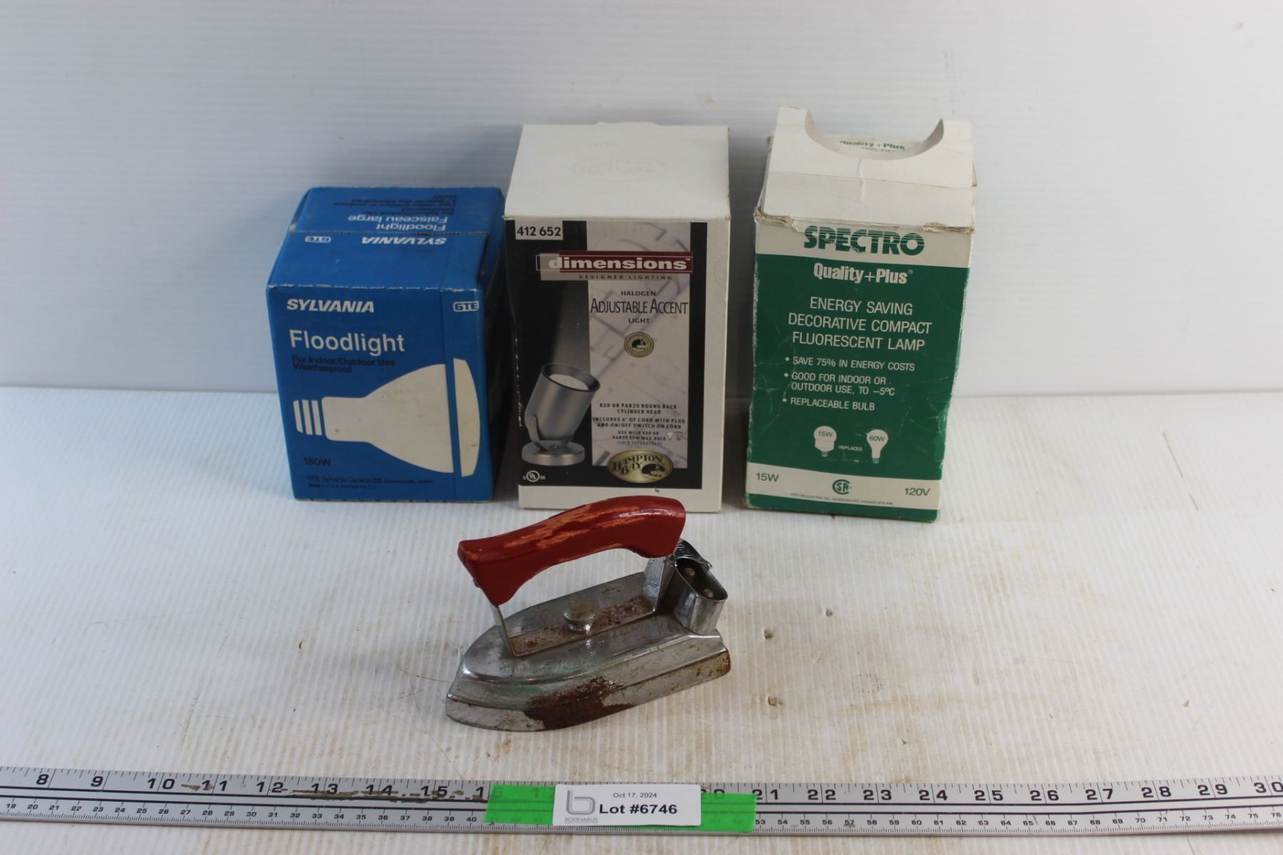 Floodlight, Halogen Adjustable Light, Energy Saving Fluorescent Lamp - As Is and Vintage Electric Iron