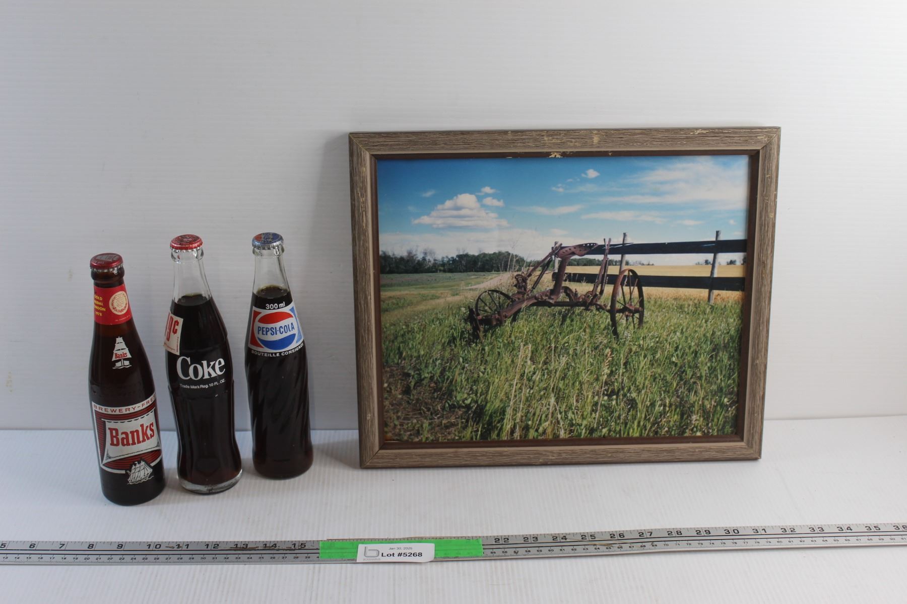 Framed Farm Art Print 15'' x 13'' and Vintage Coca Cola, Pepsi and Banks Soda Pop - Sealed