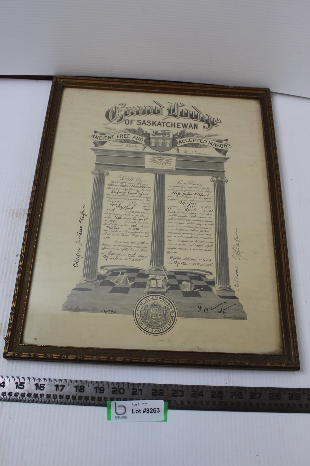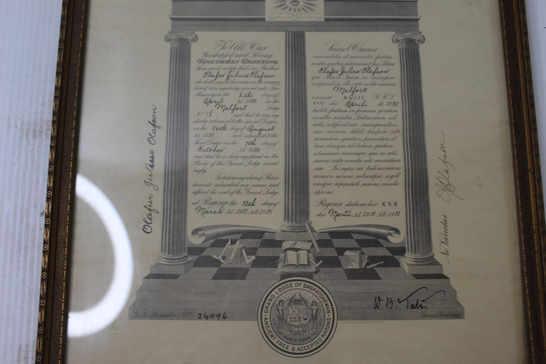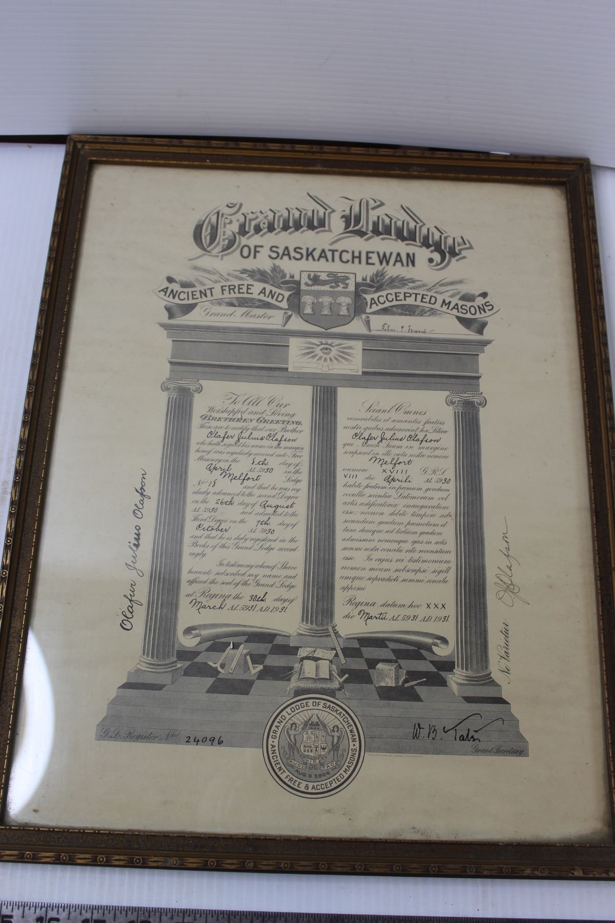 Framed Grand Lodge of Saskatchewan Free Masons Masonic Certificate (1931?) (19-1/4 x 15-1/4")