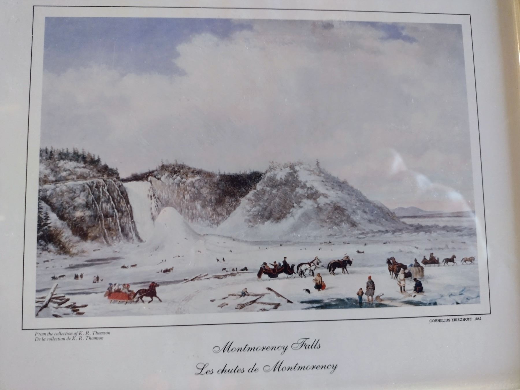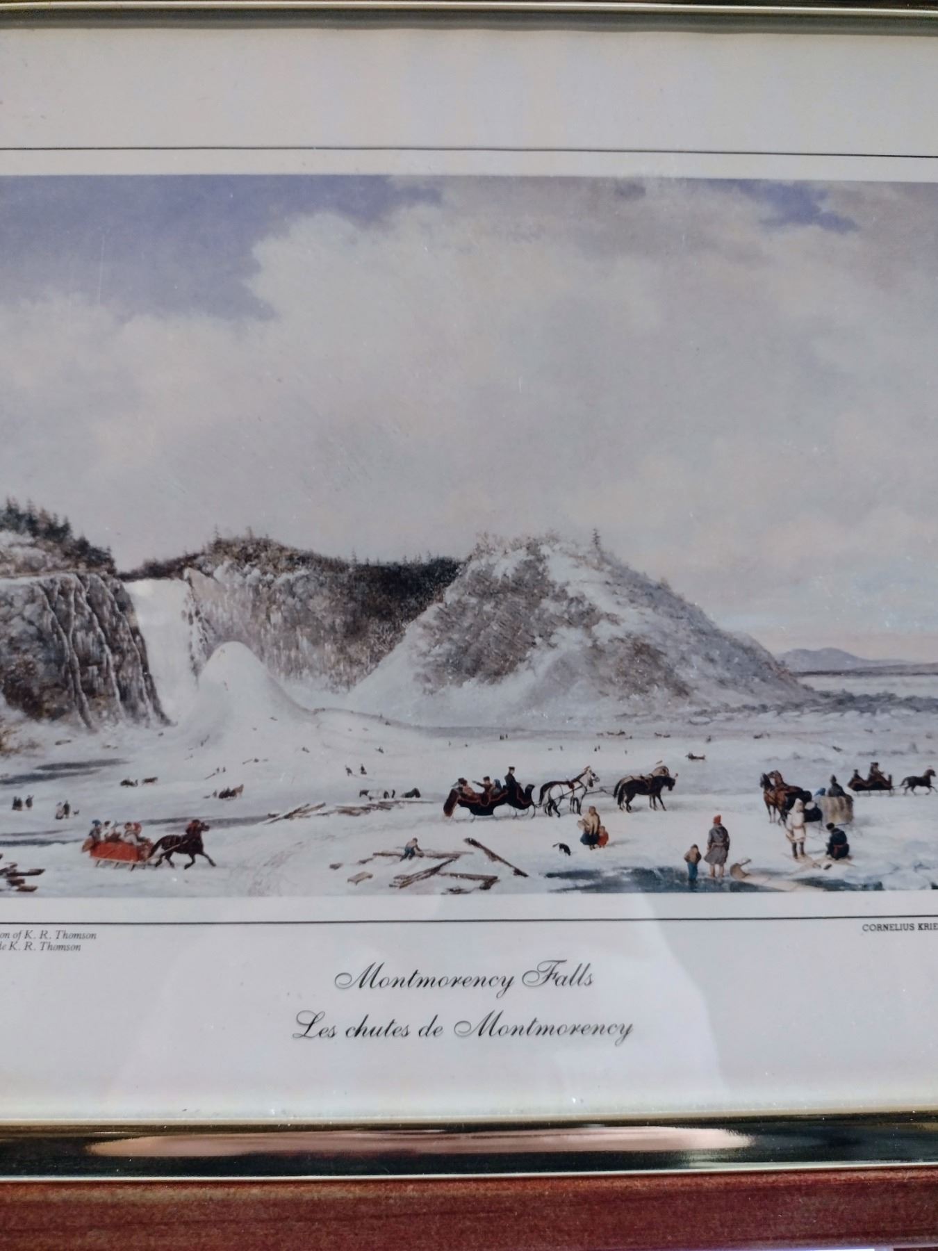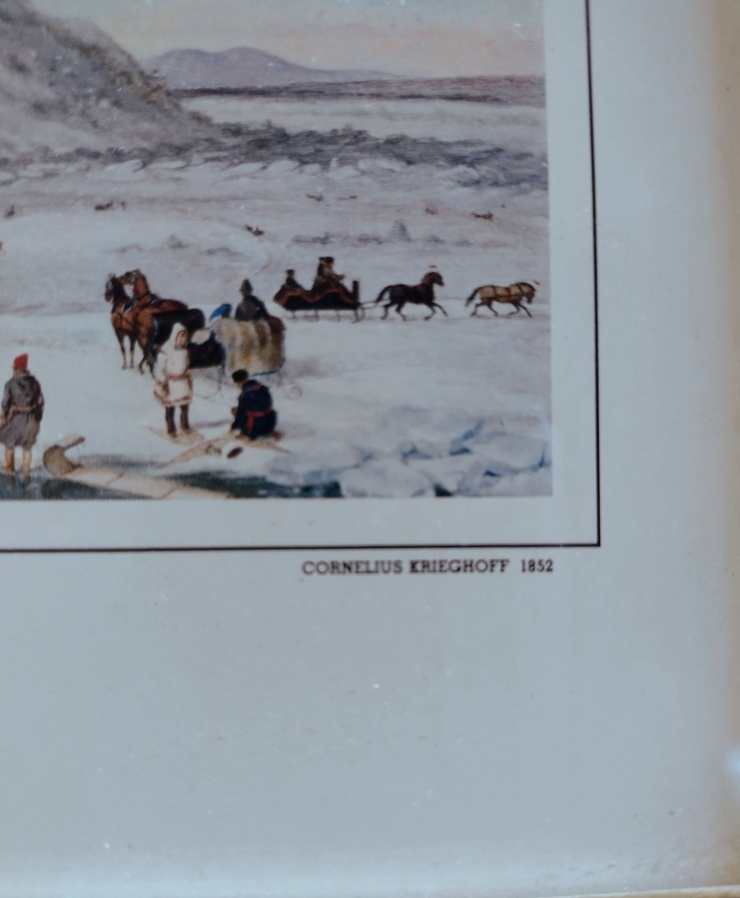 Framed print of a Quebec scene entitled “Settlers, Horse and sleigh.” Artist Cornelius Krieghoff, circa 1850. 10 ½ inches in length, 8 ½ inches in width.