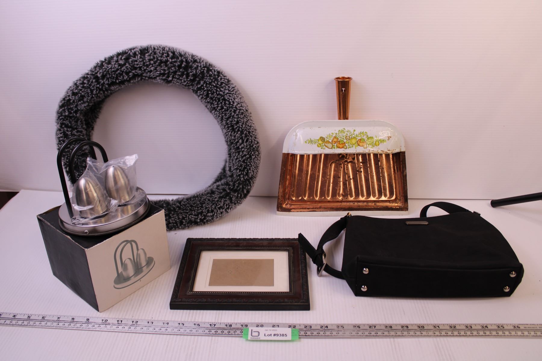 Frankie & Johnnie Purse, Salt & Pepper/Napkin Holder (NIB), Dust Pan, Steering Wheel Cover, and Frame