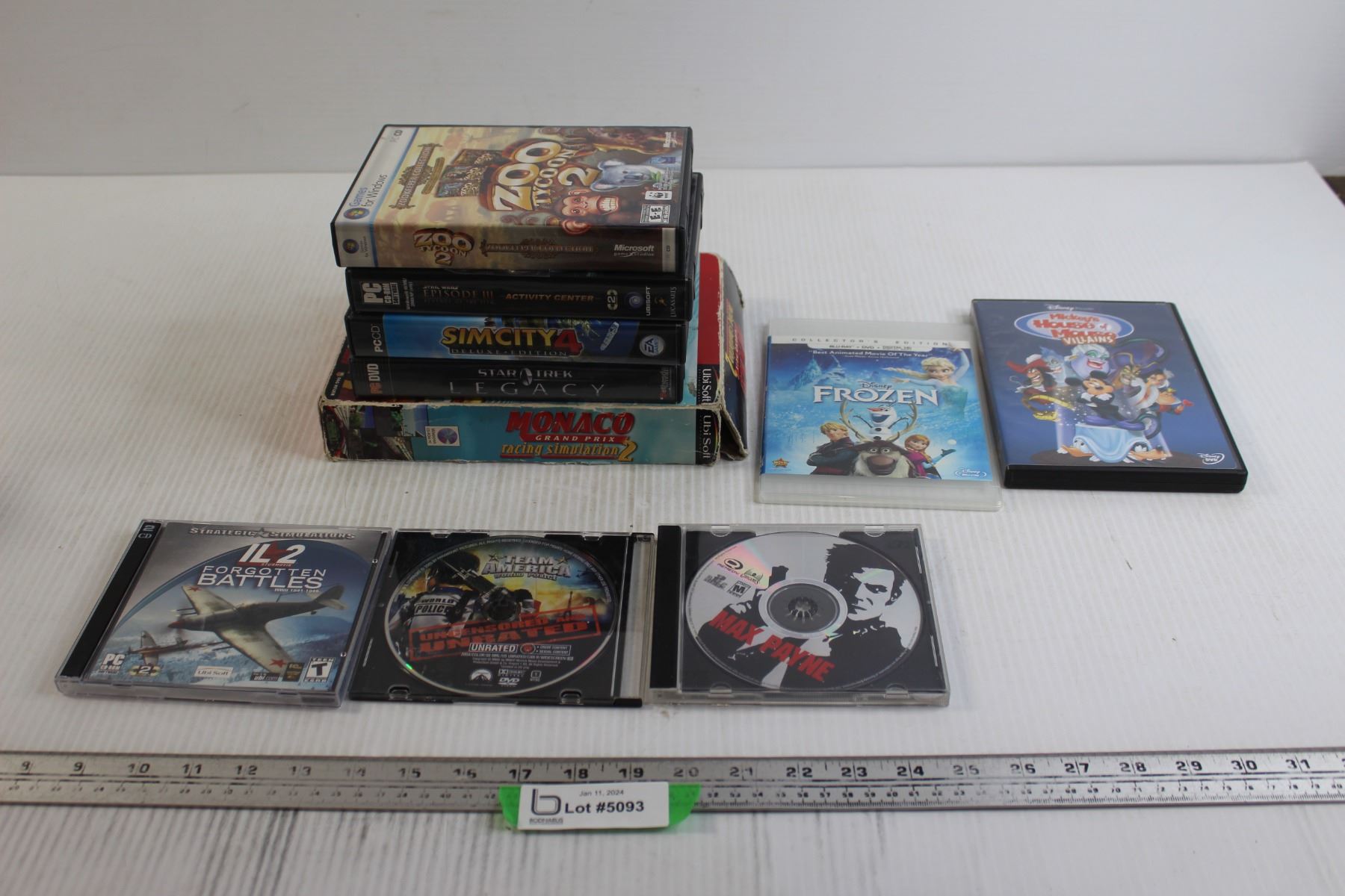 Frozen DVD, Mickey's House of Mouse Villains DVD, (8) PC Games - Sim City 4, Star Trek Legacy, Max P