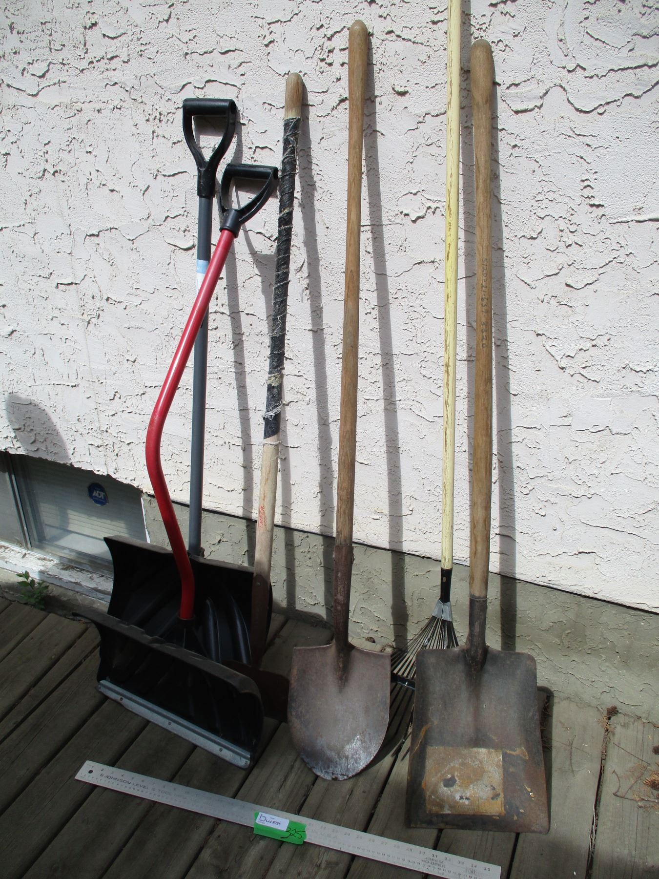 Garden Tools - (2) Snow Shovel, Leaf Rake, Spade Shovels, Ice Chipper