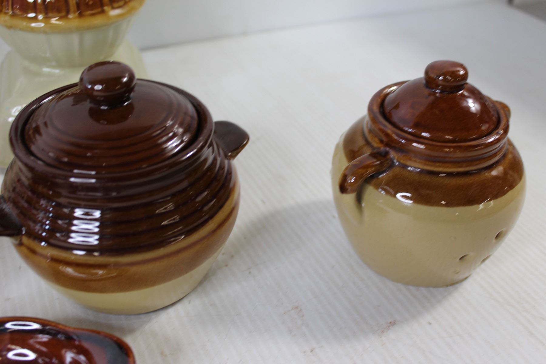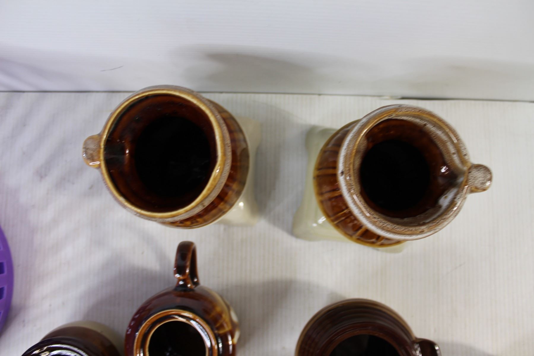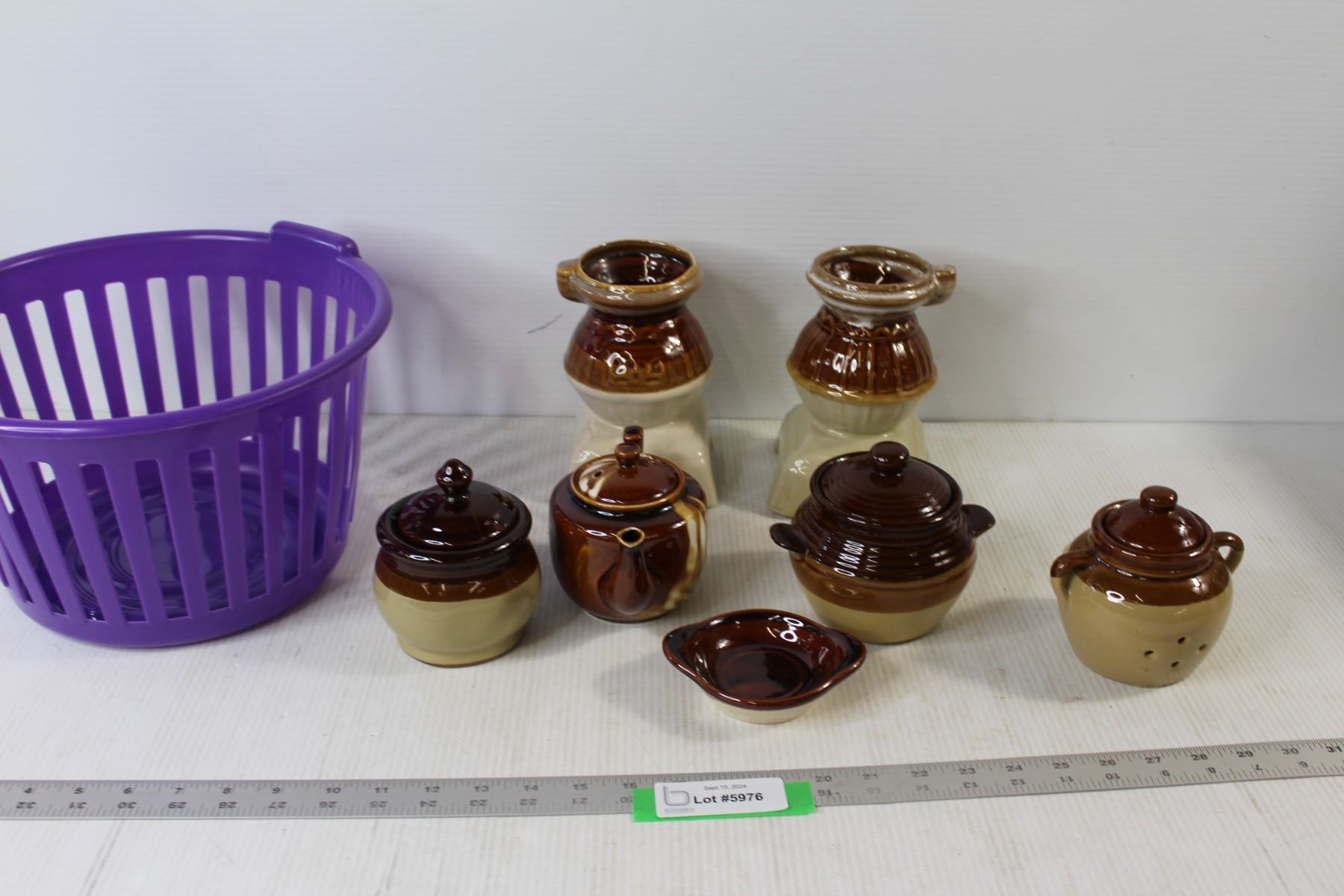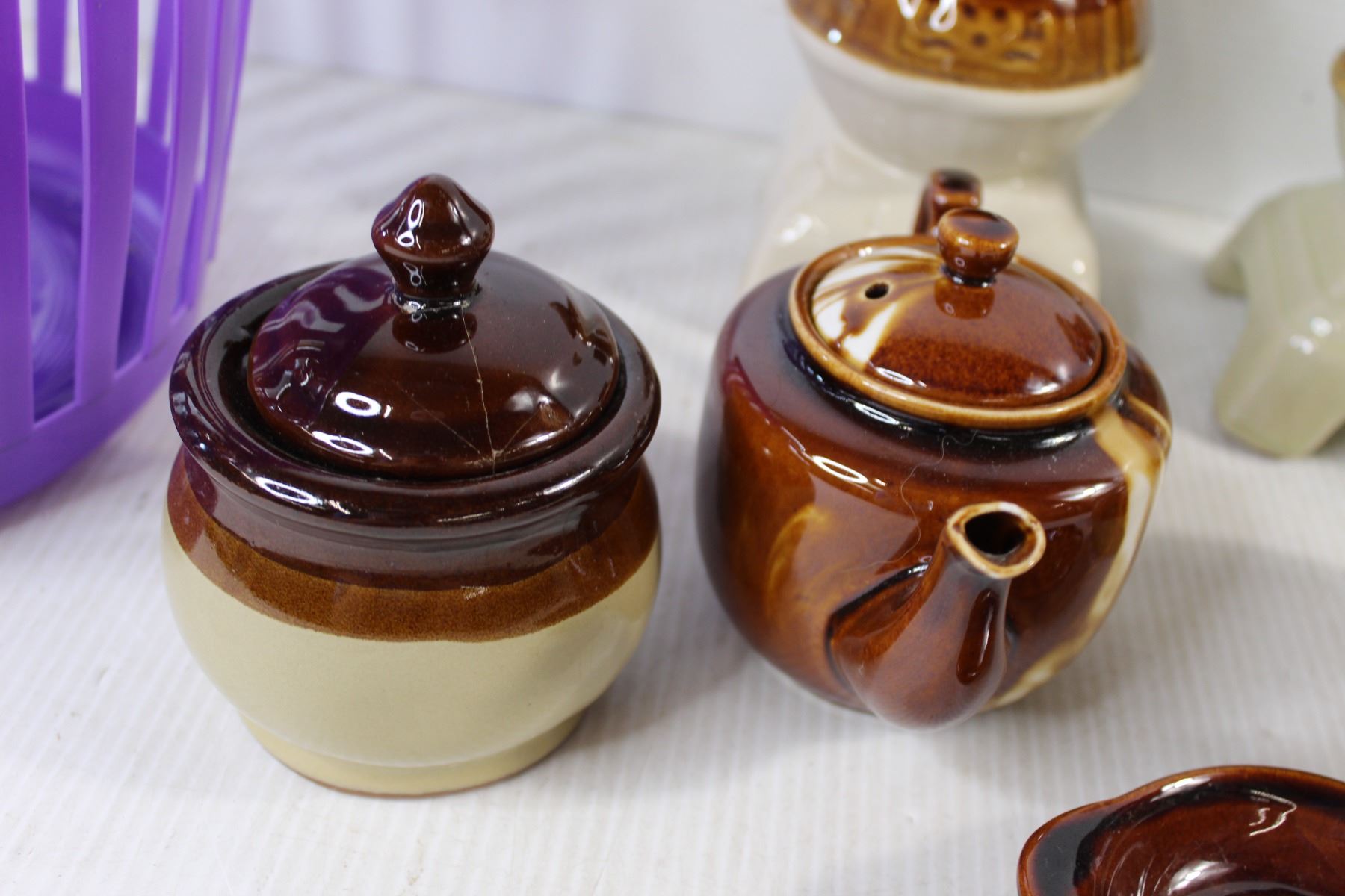 Garlic Jar, (2) Sugar Dishes, (20 Spoon Holders, teapot, Saucer, Purple Basket