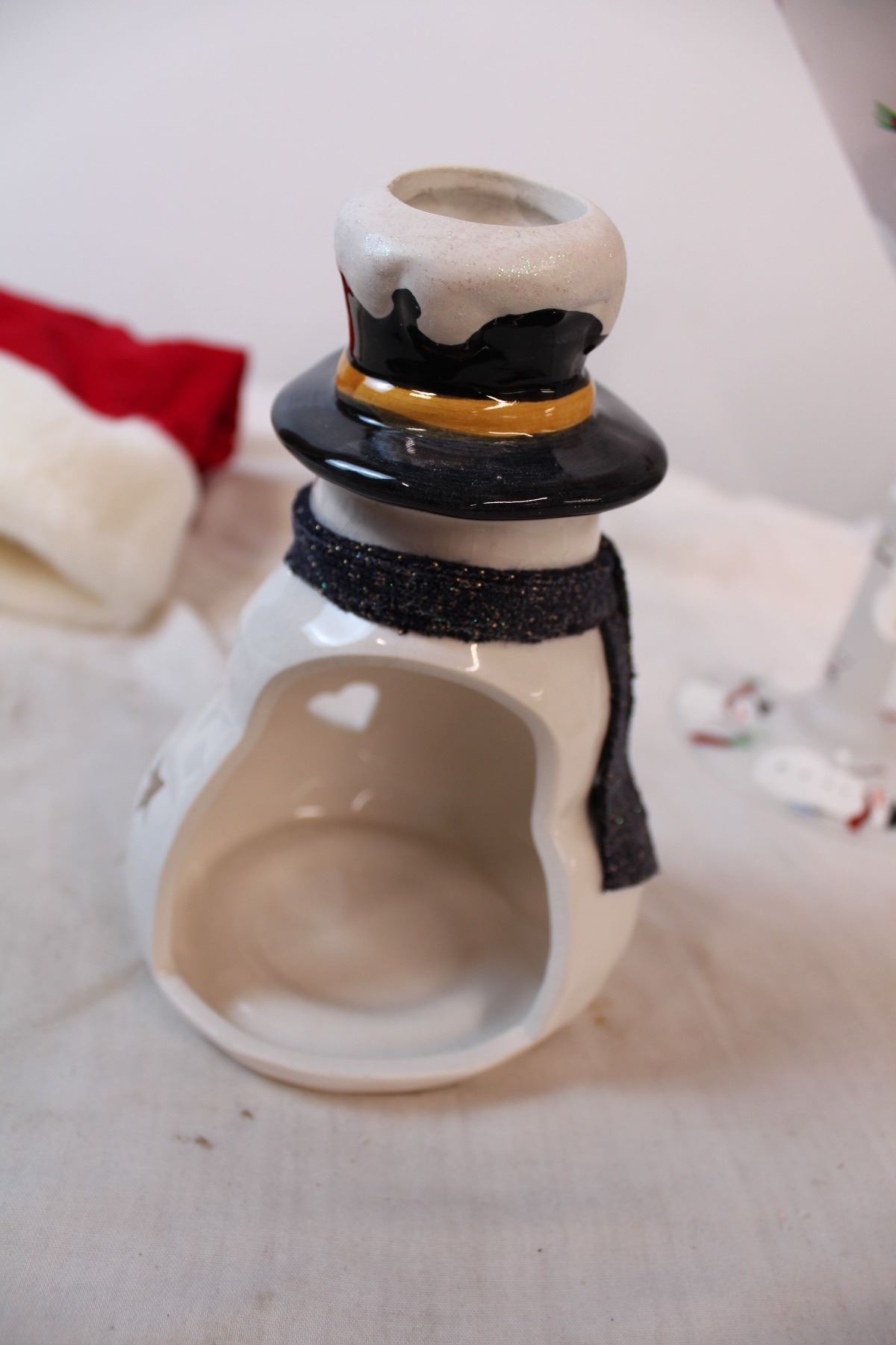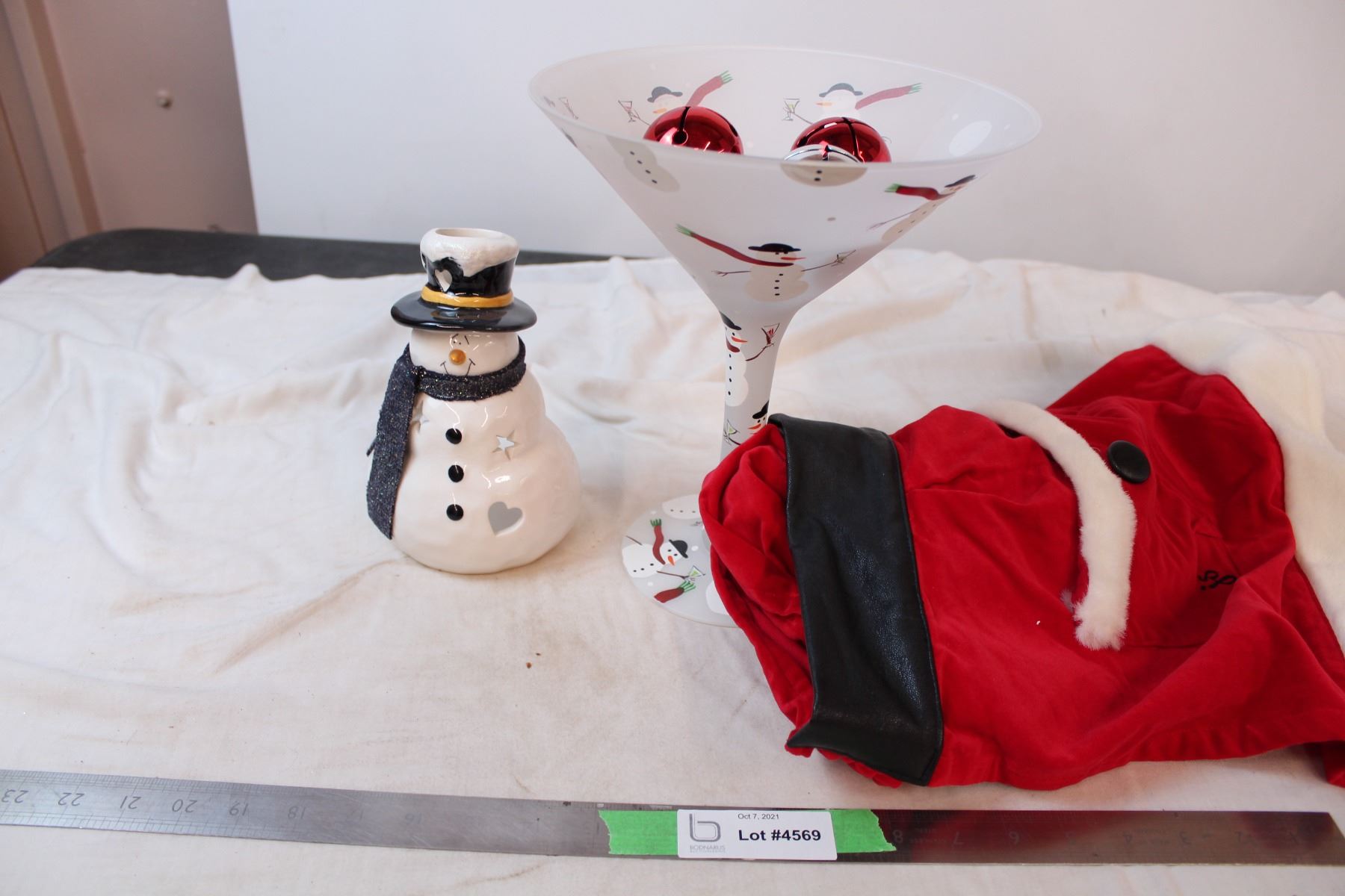 Giant snowman martini glass, snowman candle holder, and santa apron
