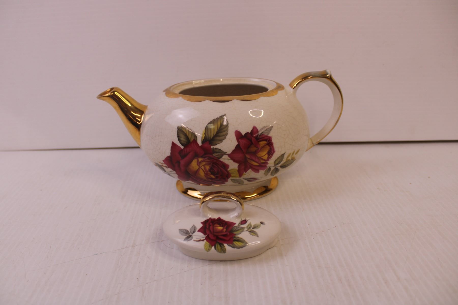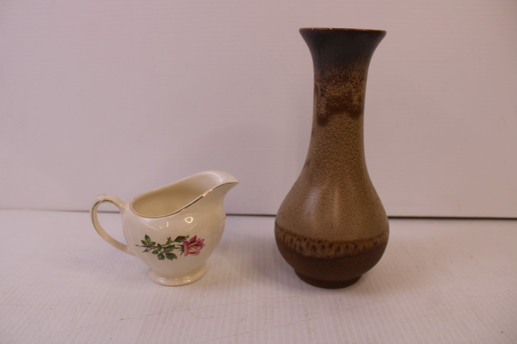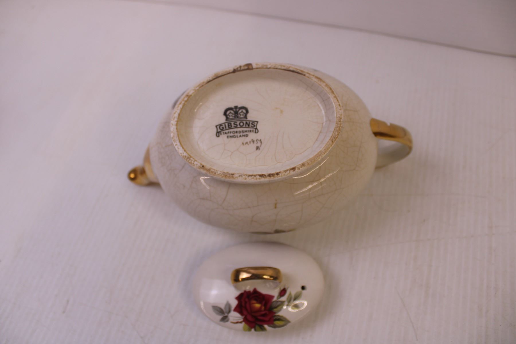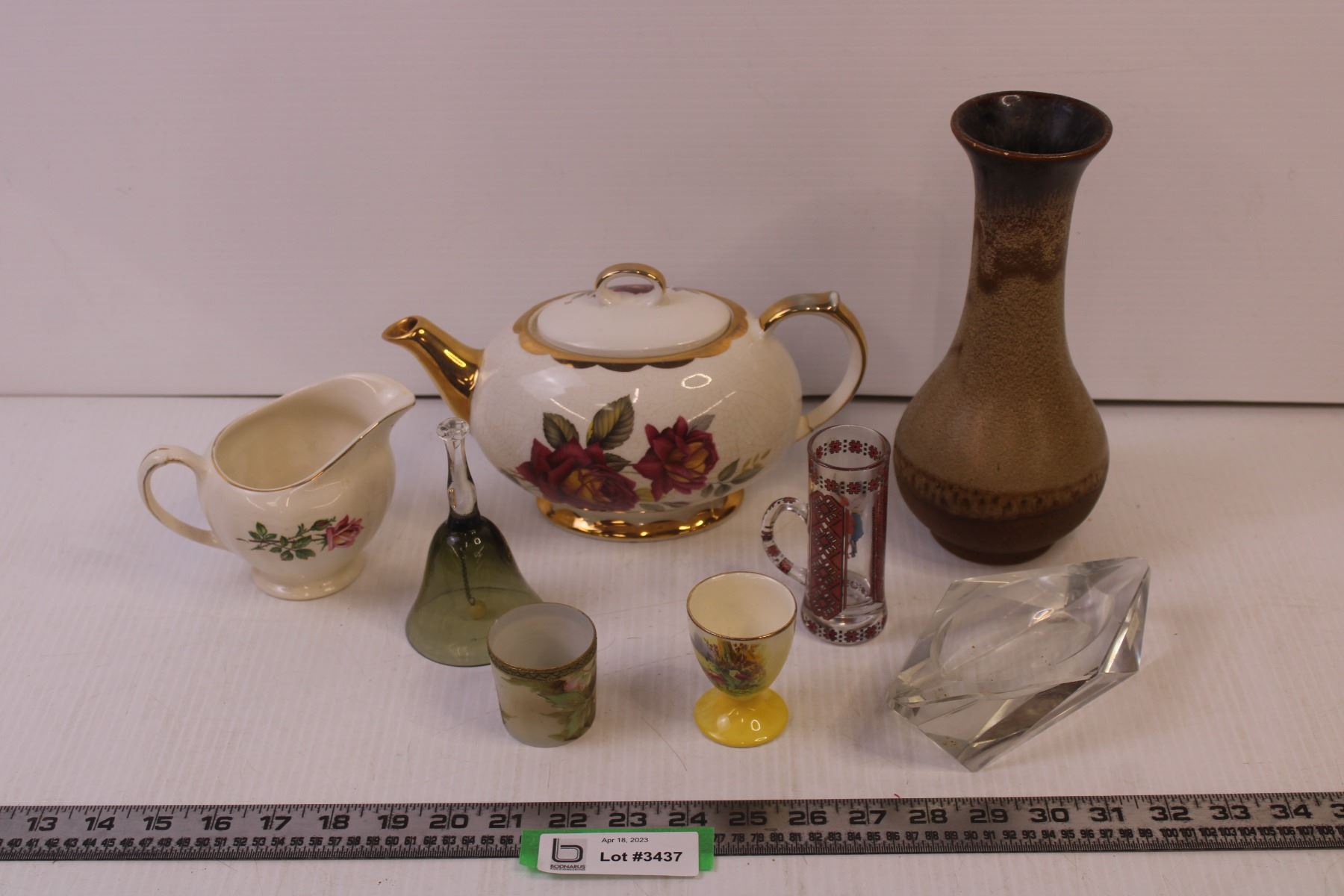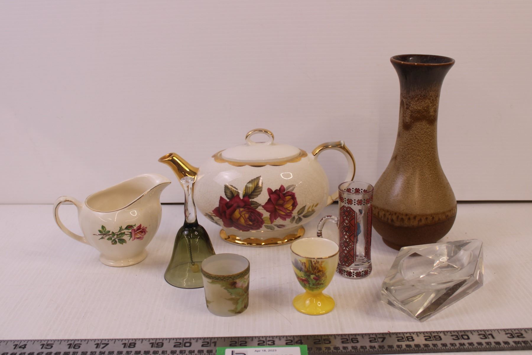 Gibsons Stafford Shire teapot, pottery vase, bell, shotglass, J&G Meakin cream, small serving dishes