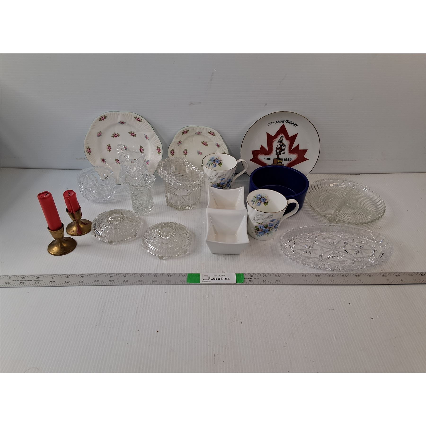 Glass And China Lot - Glass Trays/Dishes, Candle Holders, Terracotta Pot, Bone China, Ceramic Dish