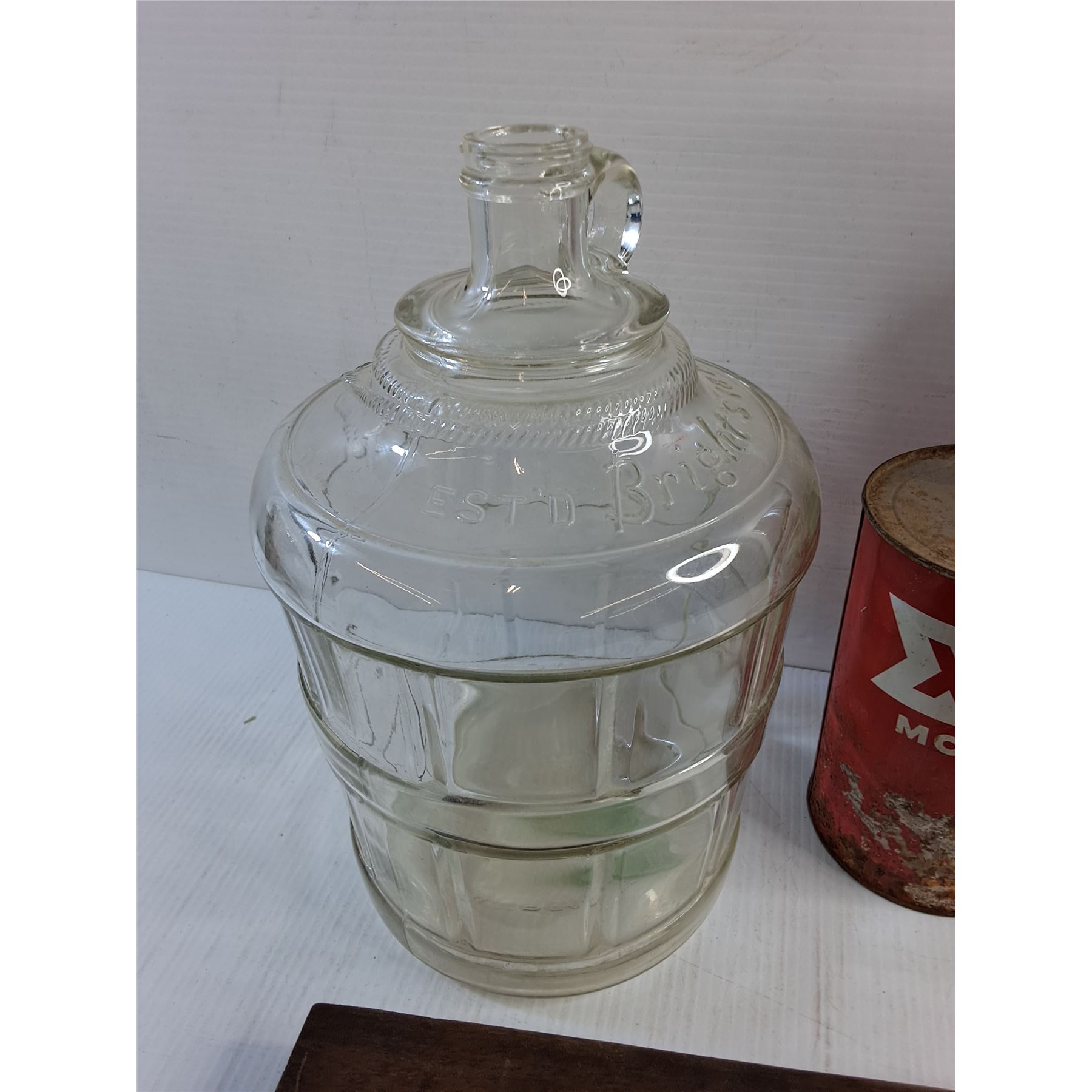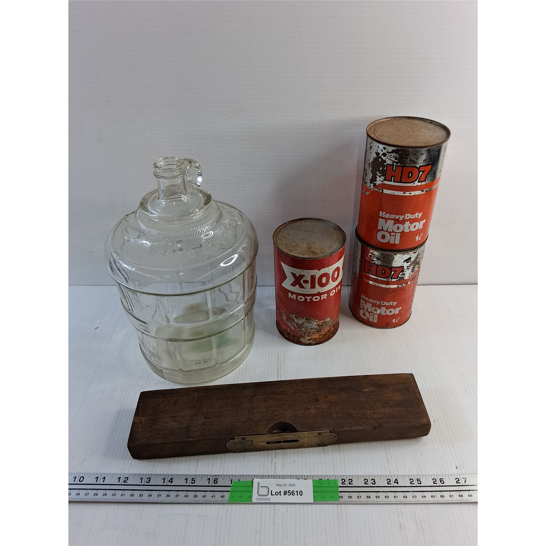 Glass Bottle, (3) Cans of Motor Oil and Carpenters Level - Cannot Ship