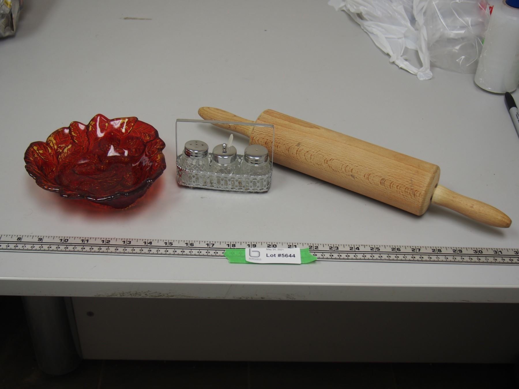Glass Bowl, Salt and Pepper Shakers and Vintage Wooden Rolling Pin