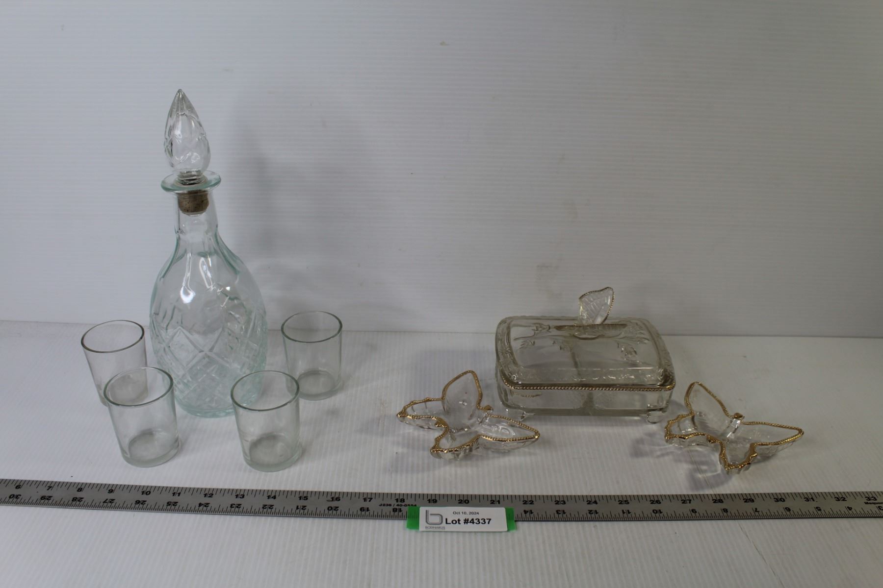 Glass Decanter w/4 Glasses - Glass Dresser Set w/Gold edges (dish wing tip is broken off - it is in dish)