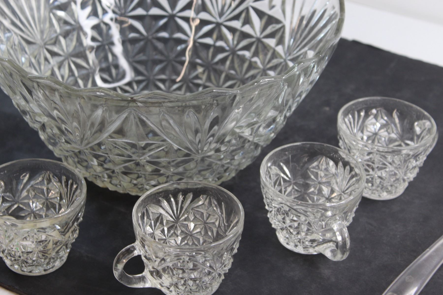 Glass Punch Bowl 12'', (7) Glass Cups and Plastic Ladle