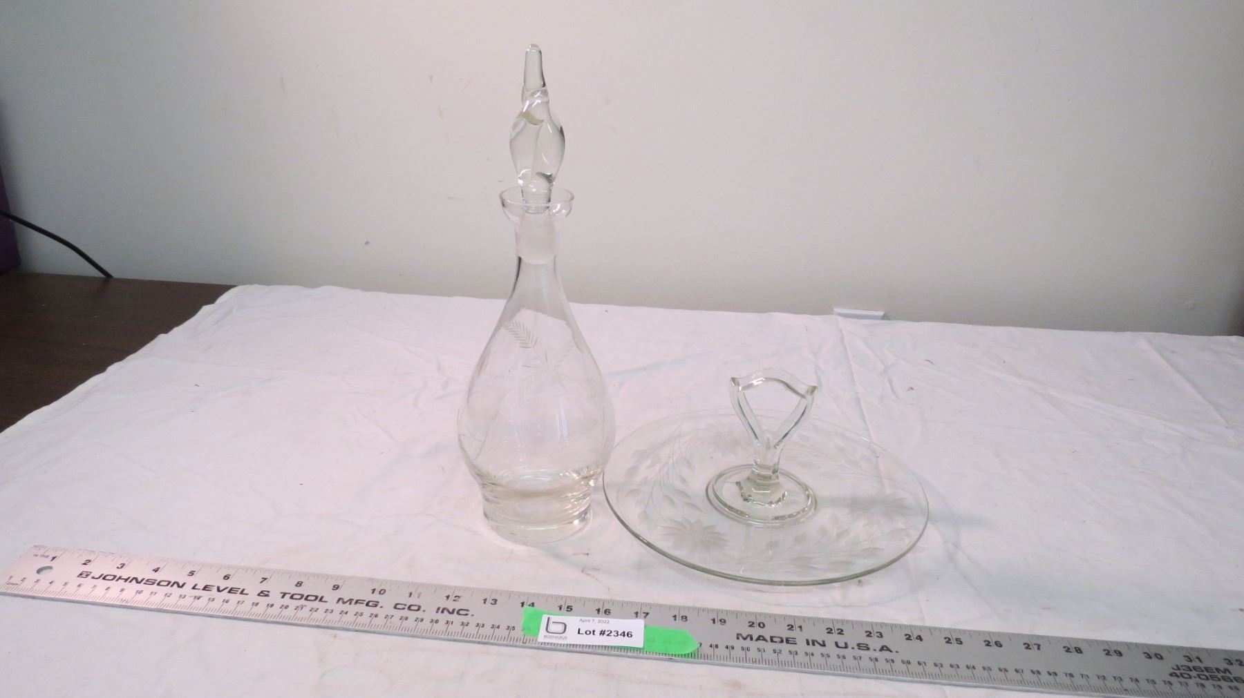 Glass decanter + etched glass serving tray