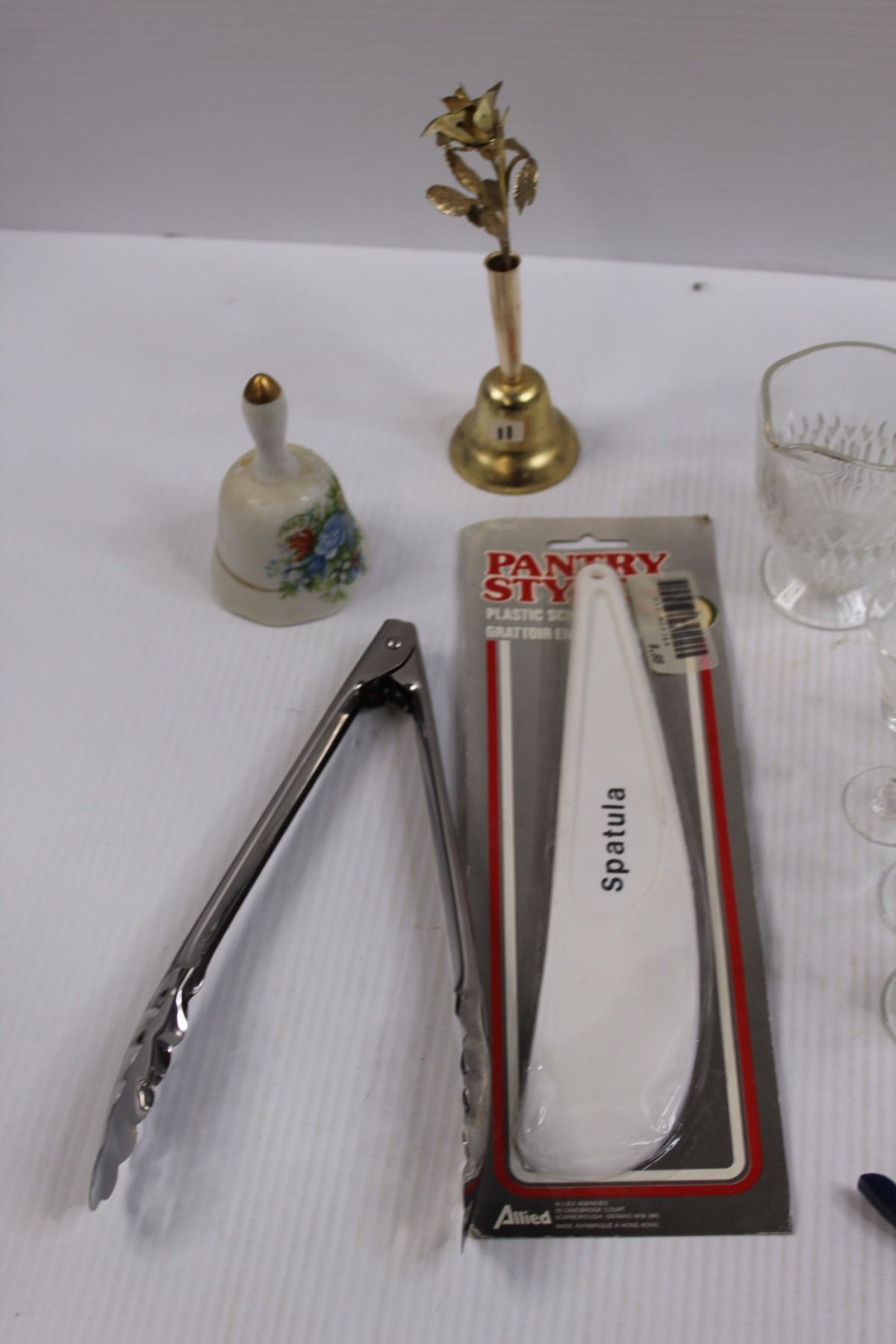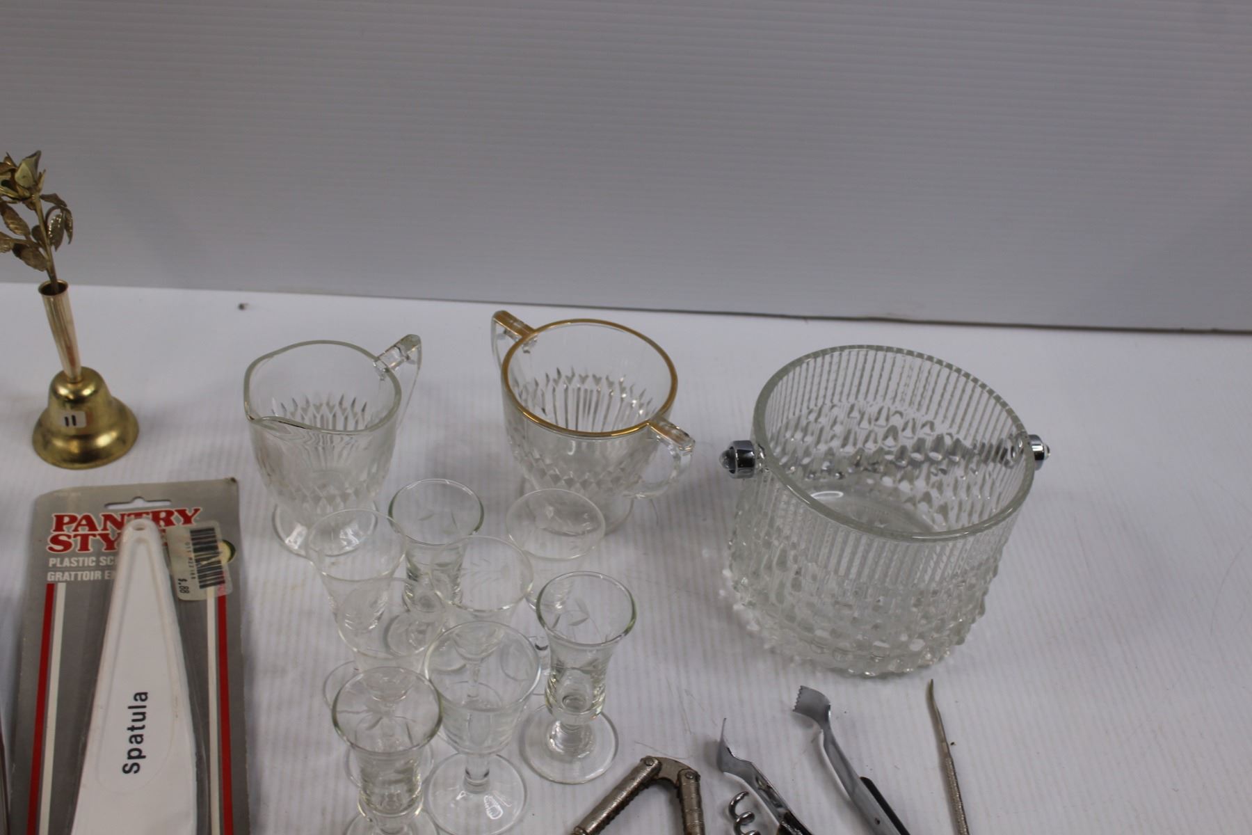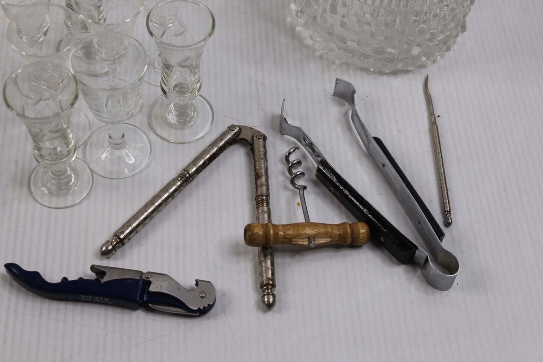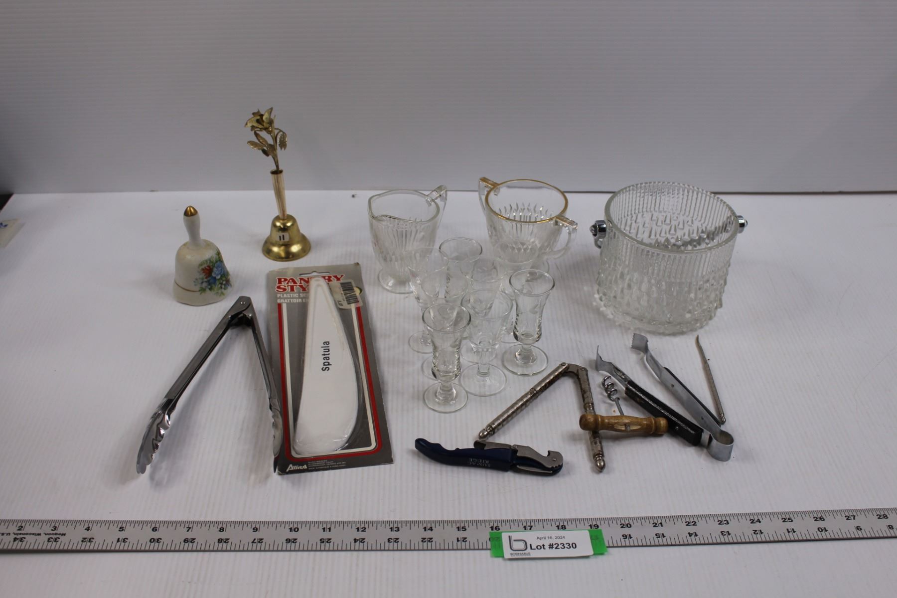 Glassware (Ice Pot, Sherry Glasses, Pitcher, Sugar Dish), Tongs, Spatula, Bells, Cork Screws & Nutcracker and Pick