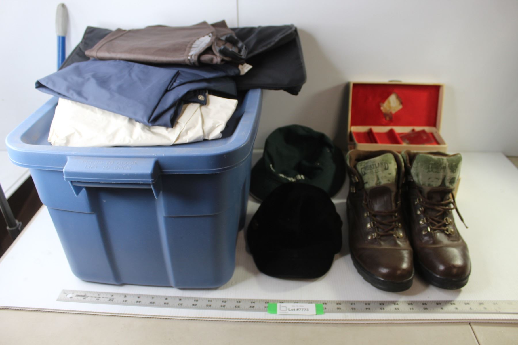 Greatland Thinsulate Hiking Shoes - Size 12, Vintage Jewelry Box - As Is, (2) Hats - Size L/XL, 56, (5) Garment Bags, Rubbermaid Roughneck Plastic Storage Bin 15" x 21" x 12"