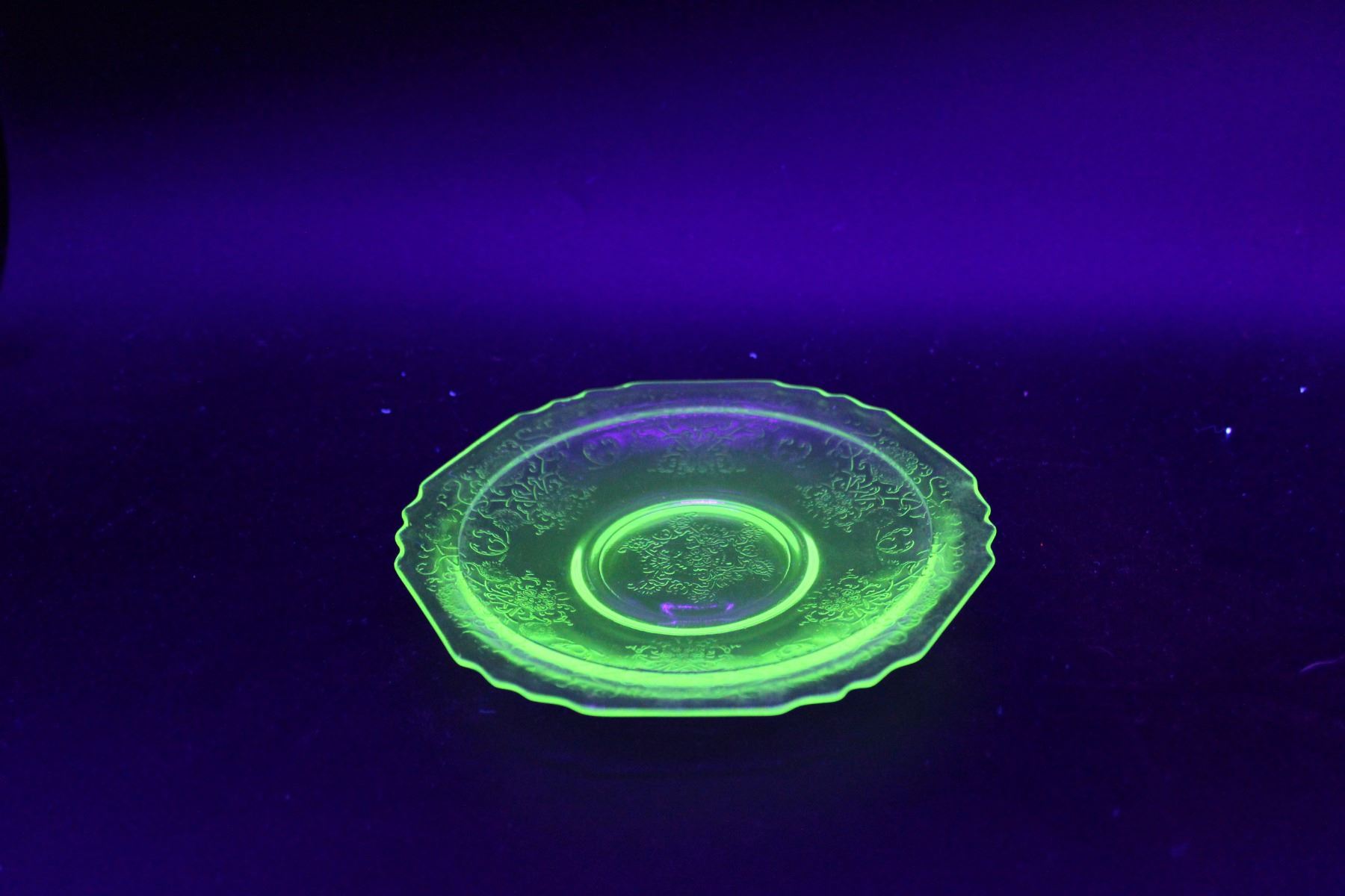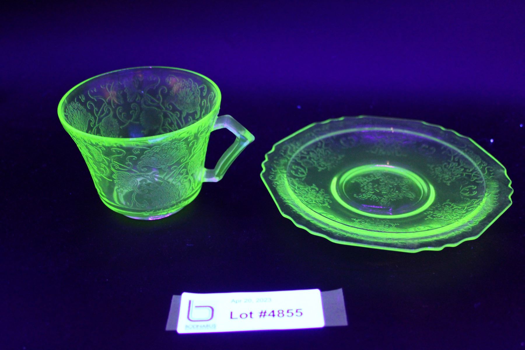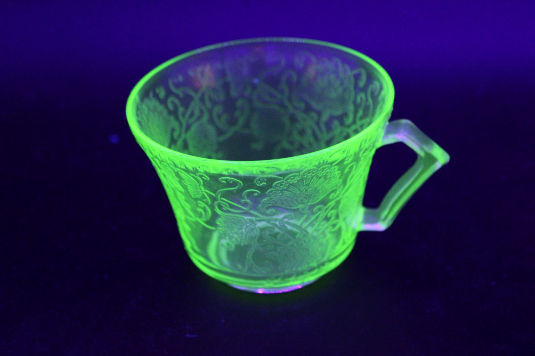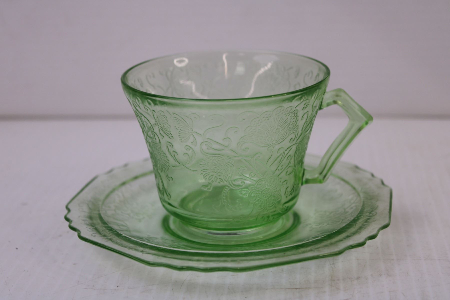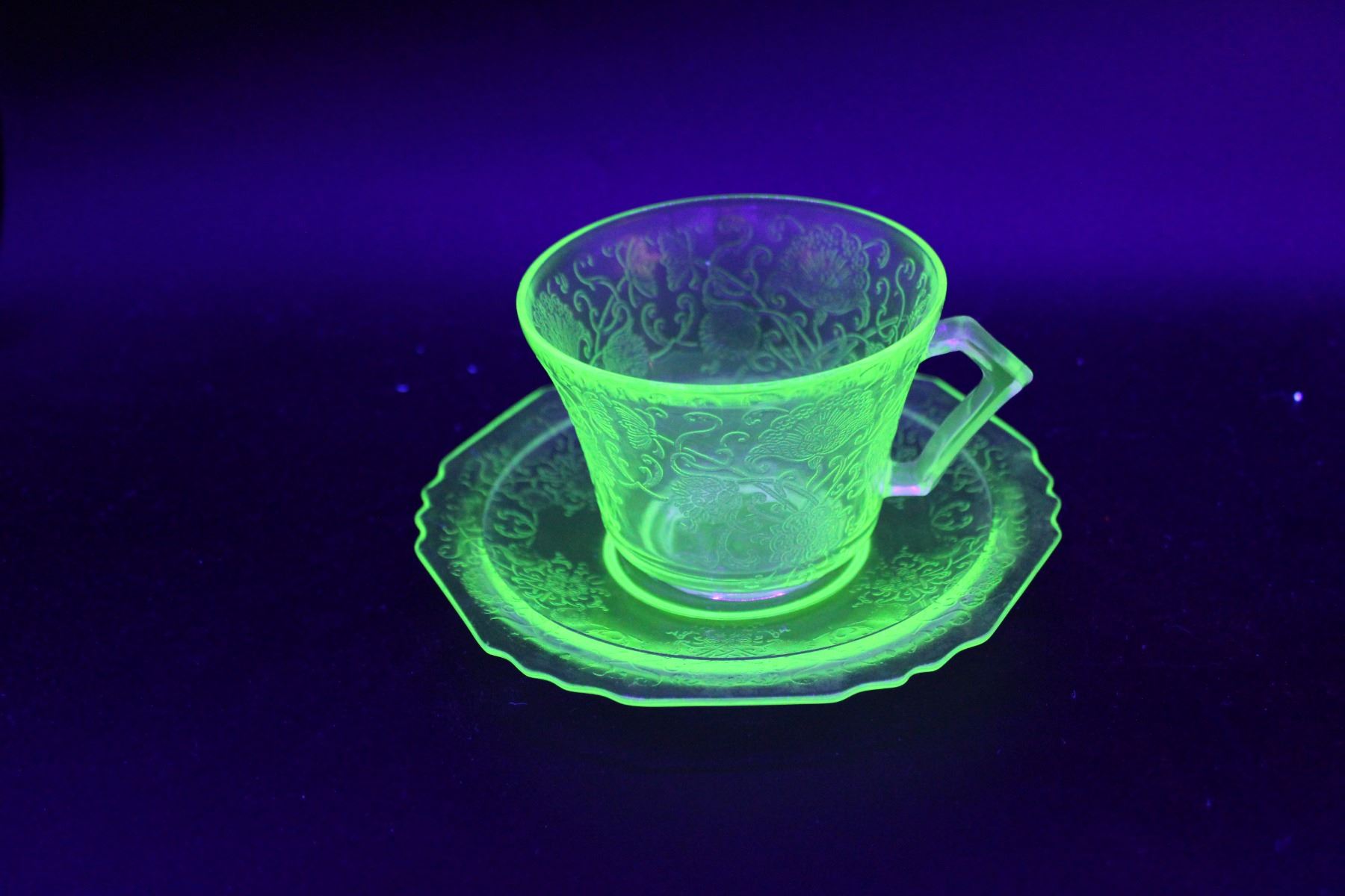 Green Depression Uranium Glass Cup and Saucer "Florentine Poppy" Pattern (Glows)