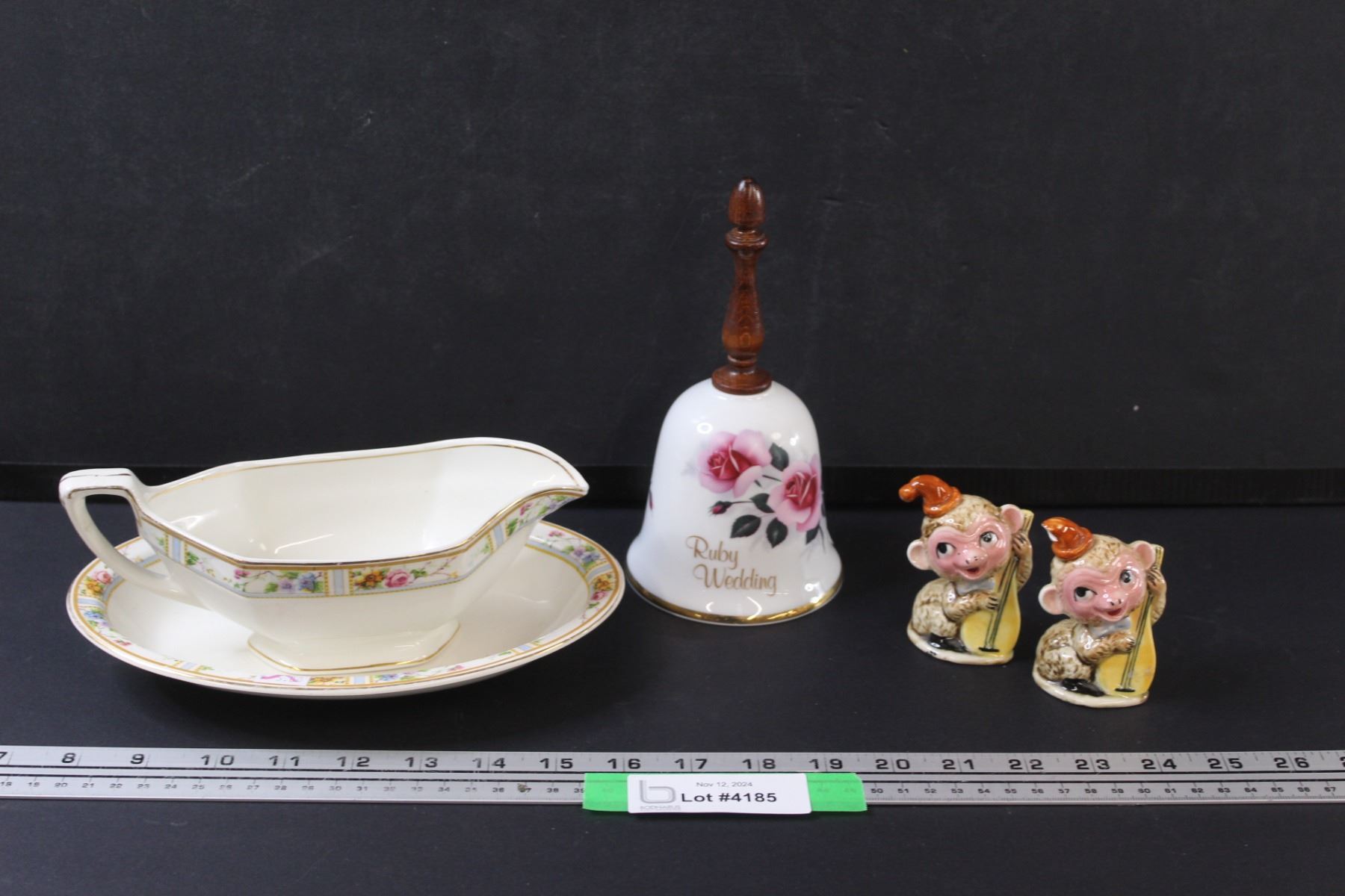 Grindley Brand Gravy Boat Set, Ruby Wedding Bell, Monkey Salt & Pepper Shakers