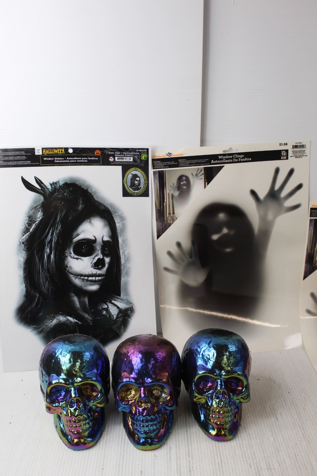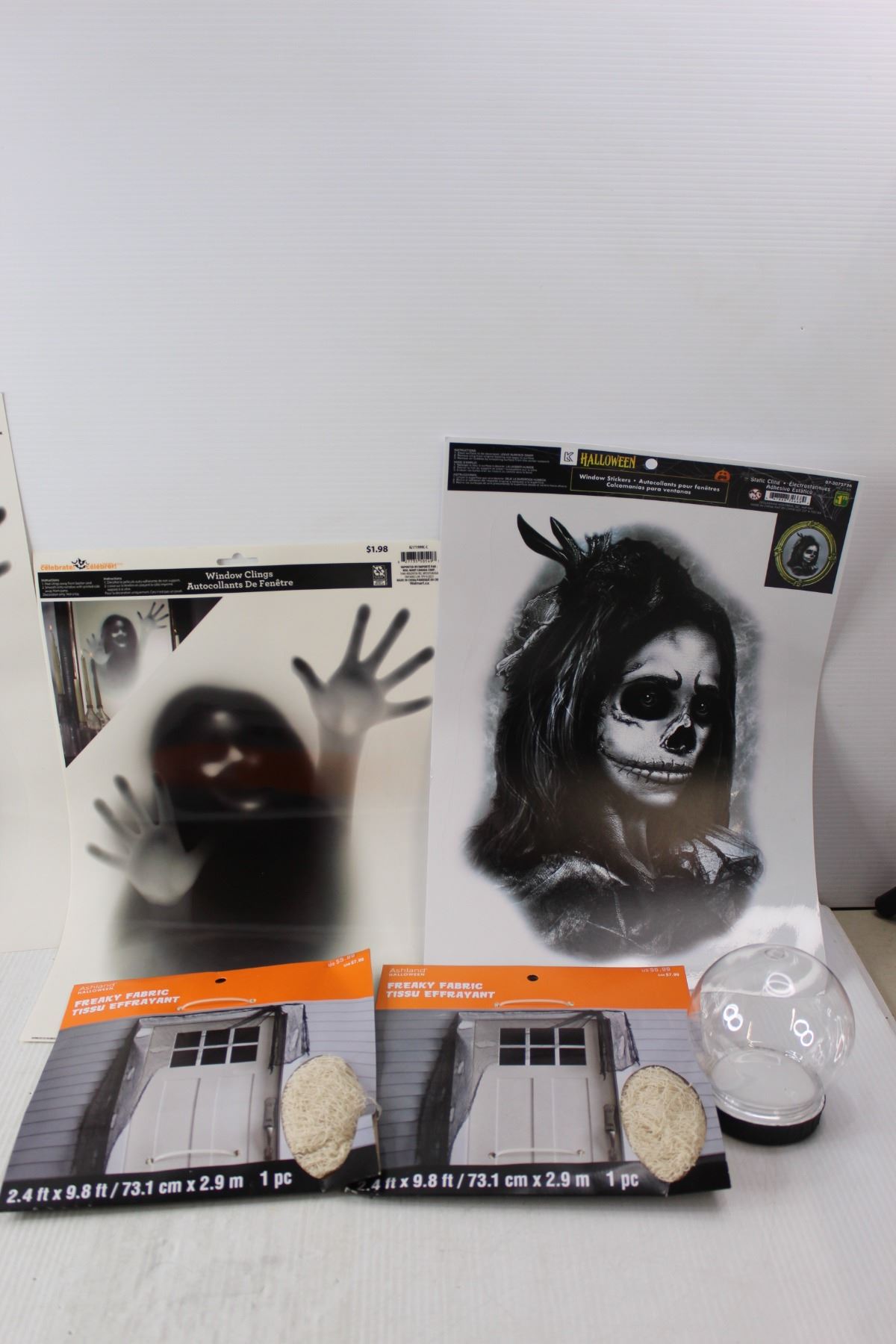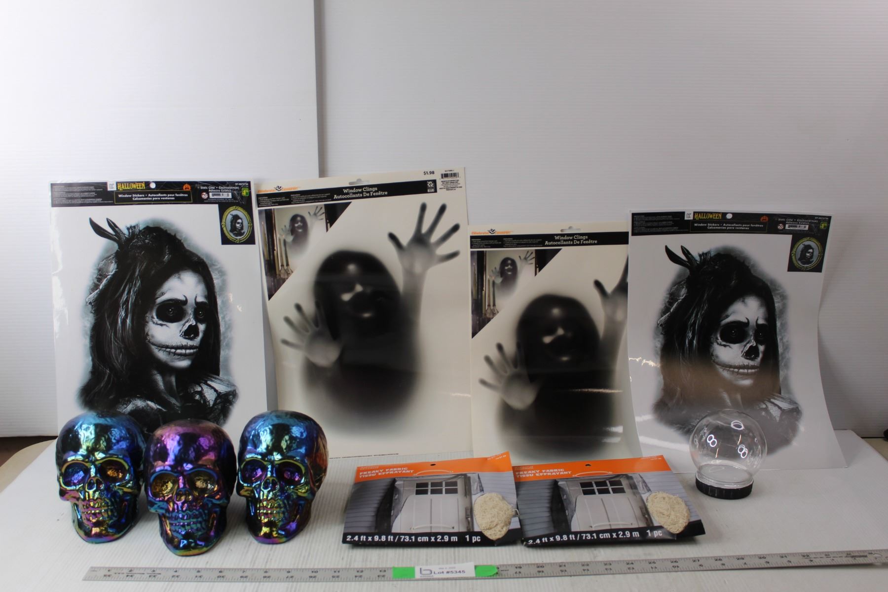 Halloween Lot- (4) Window Clings/Stickers, (3) Plastic Skulls, Decorative Fabric, Plastic Globe