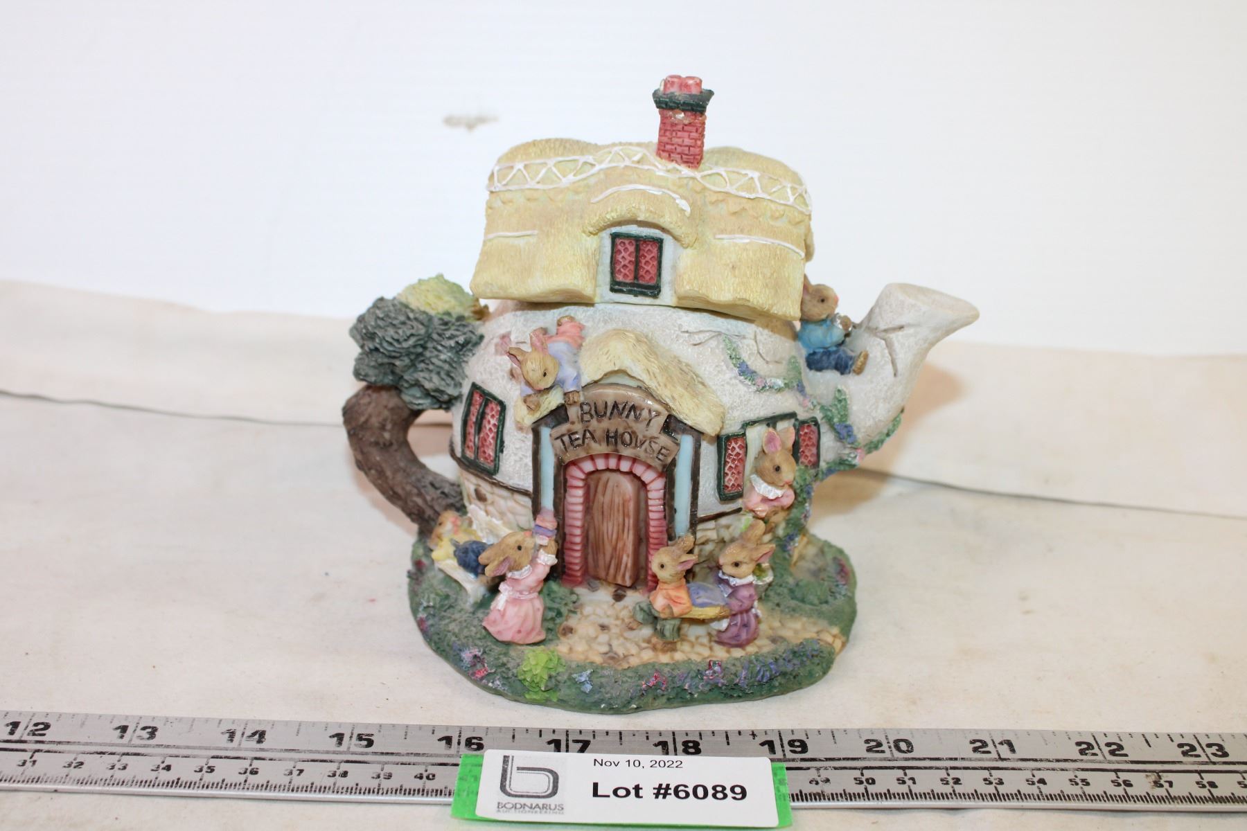 Hand Craft Ceramic Bunny Teahouse Coin Bank w/Lucky Penny