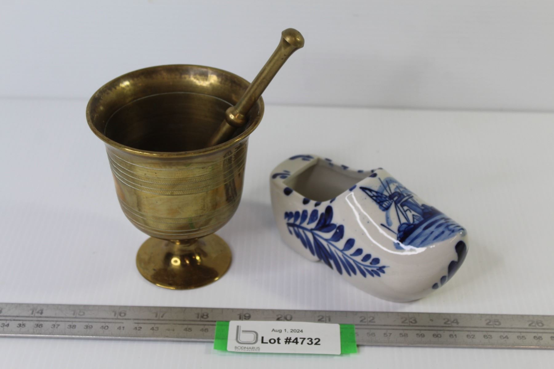 Hand Painted Delft Blue Color Ceramic Shoe - Brass Mortar & Pestle