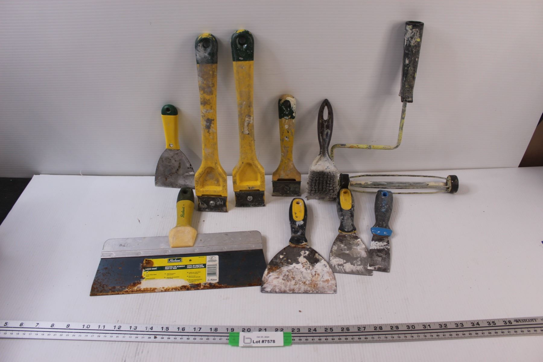 Handy Tool Lot: Scrapers, Putty Knives, Paint Roller, Metal Wire Brush