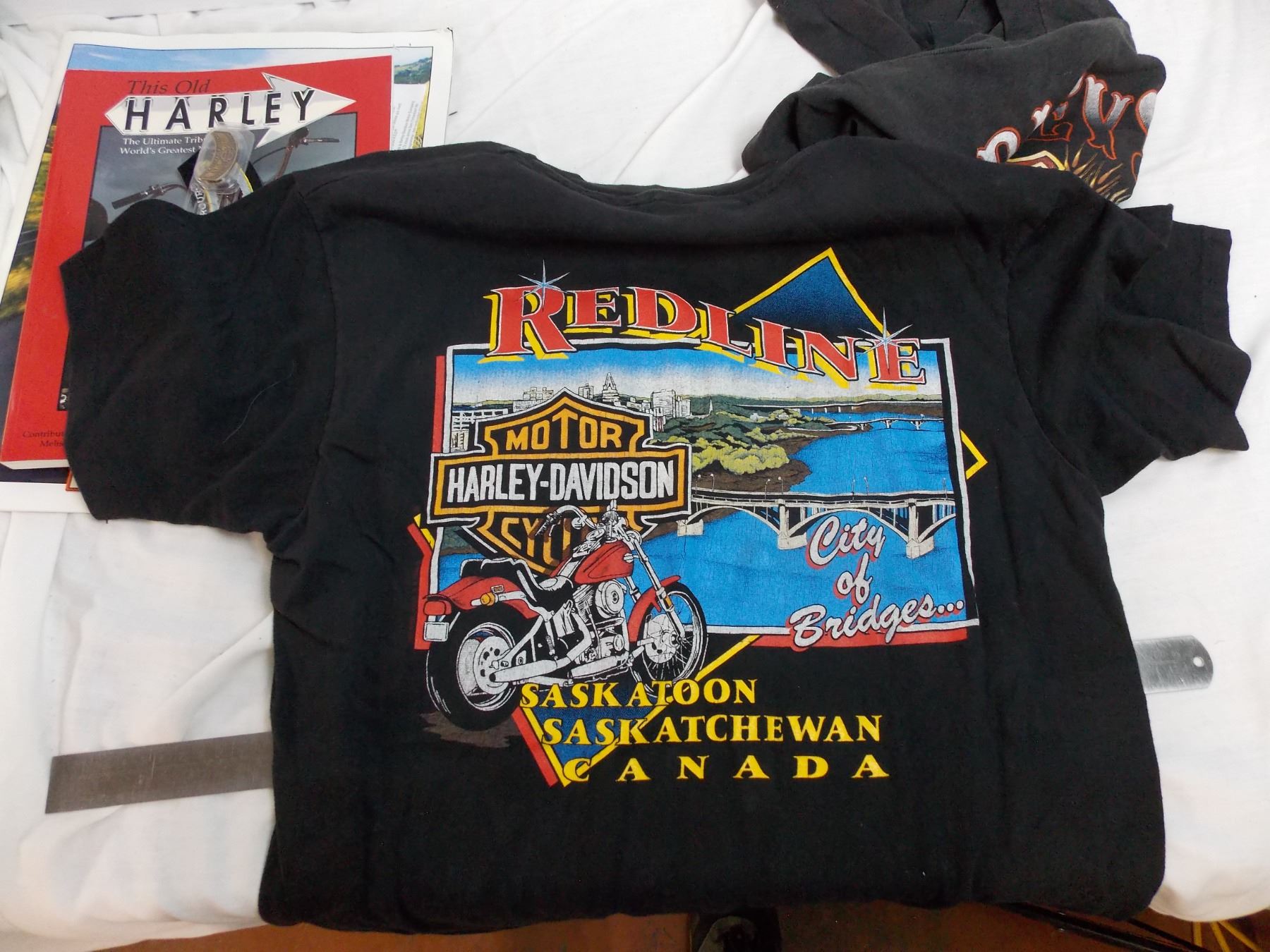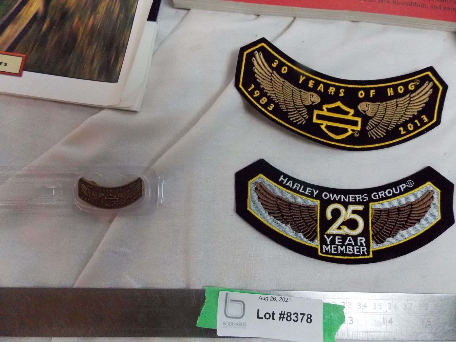 Harley 25+30 year Riders Patches, 30 years of hog pin, books, (2) harley shirts (L+M)
