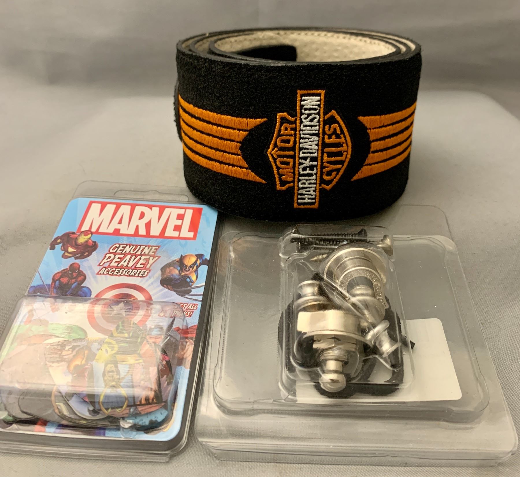 Harley-Davidson Vintage Licensed Leather Guitar Strap, Locks, & Marvel Villains Guitar Picks NIB