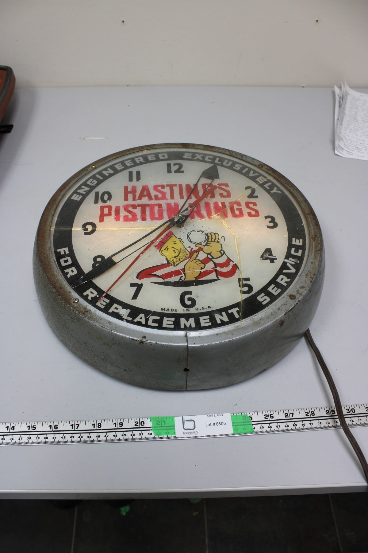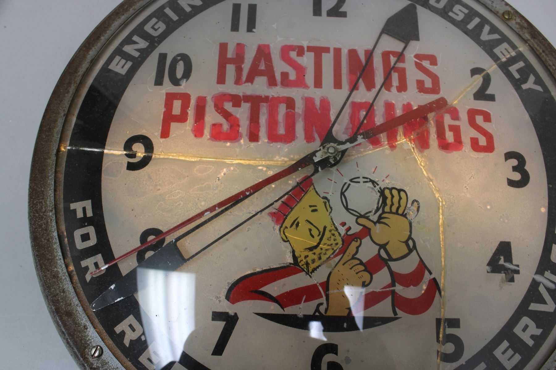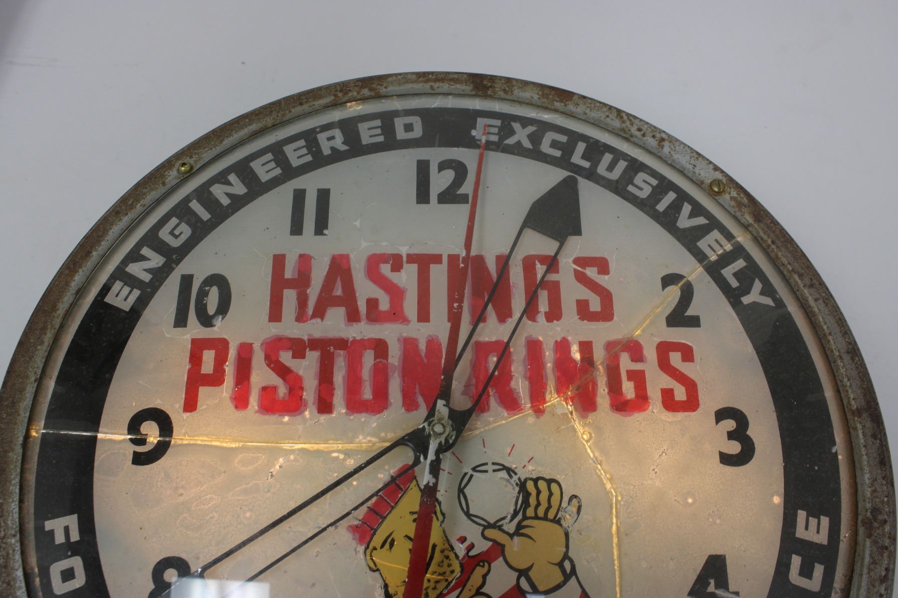 Hasting piston rings clock (working) glass is cracked 12"