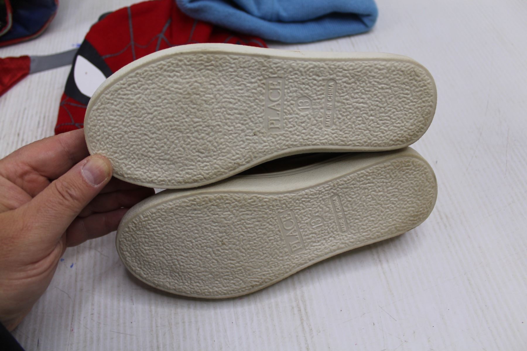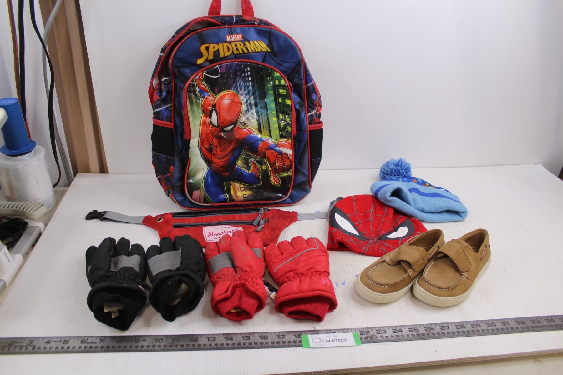 Heys Spider-Man Back Pack, (2) Pairs Children's Gloves, (2) Children's Toques, Pair of Children's Place Shoes Size 13, Brewhouse Fanny Pack