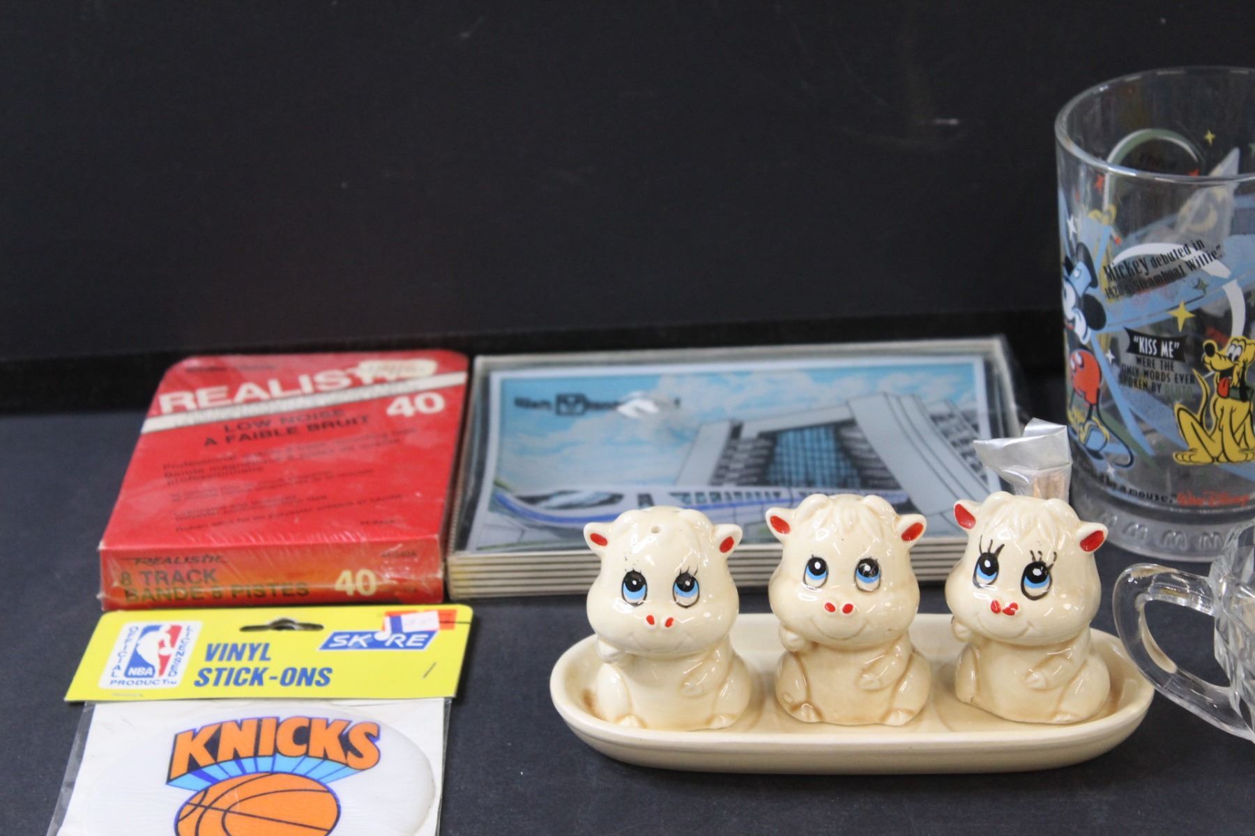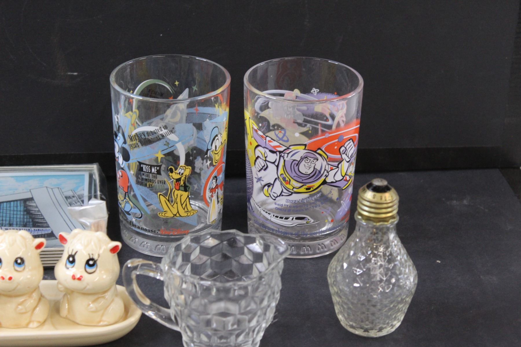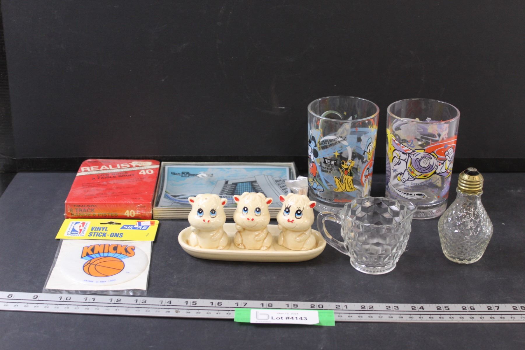 Hippo Salt & Pepper Shaker & Toothpick Set on Tray, (2) Disney Glasses, Knicks Vinyl Stick on, Misc.