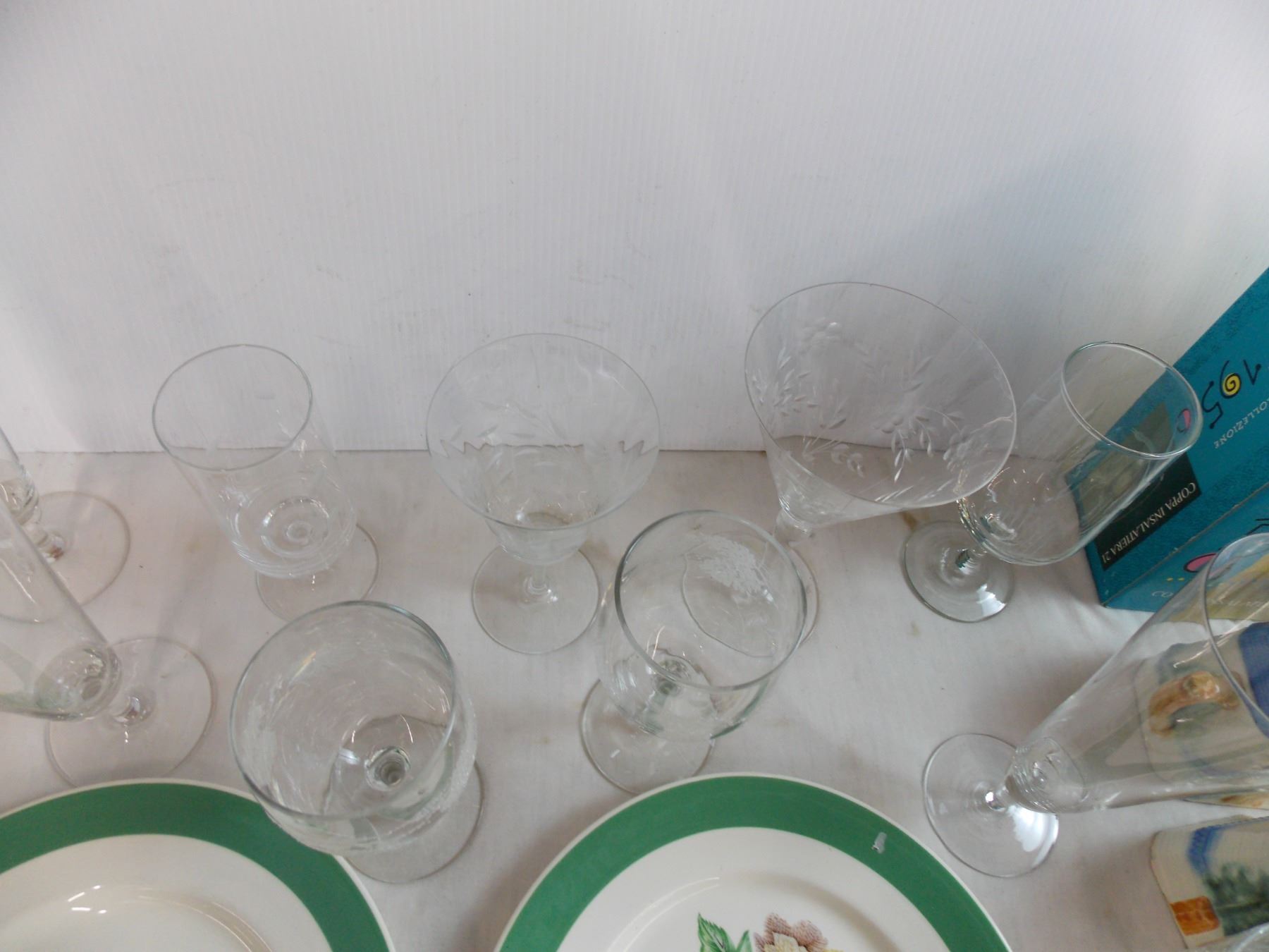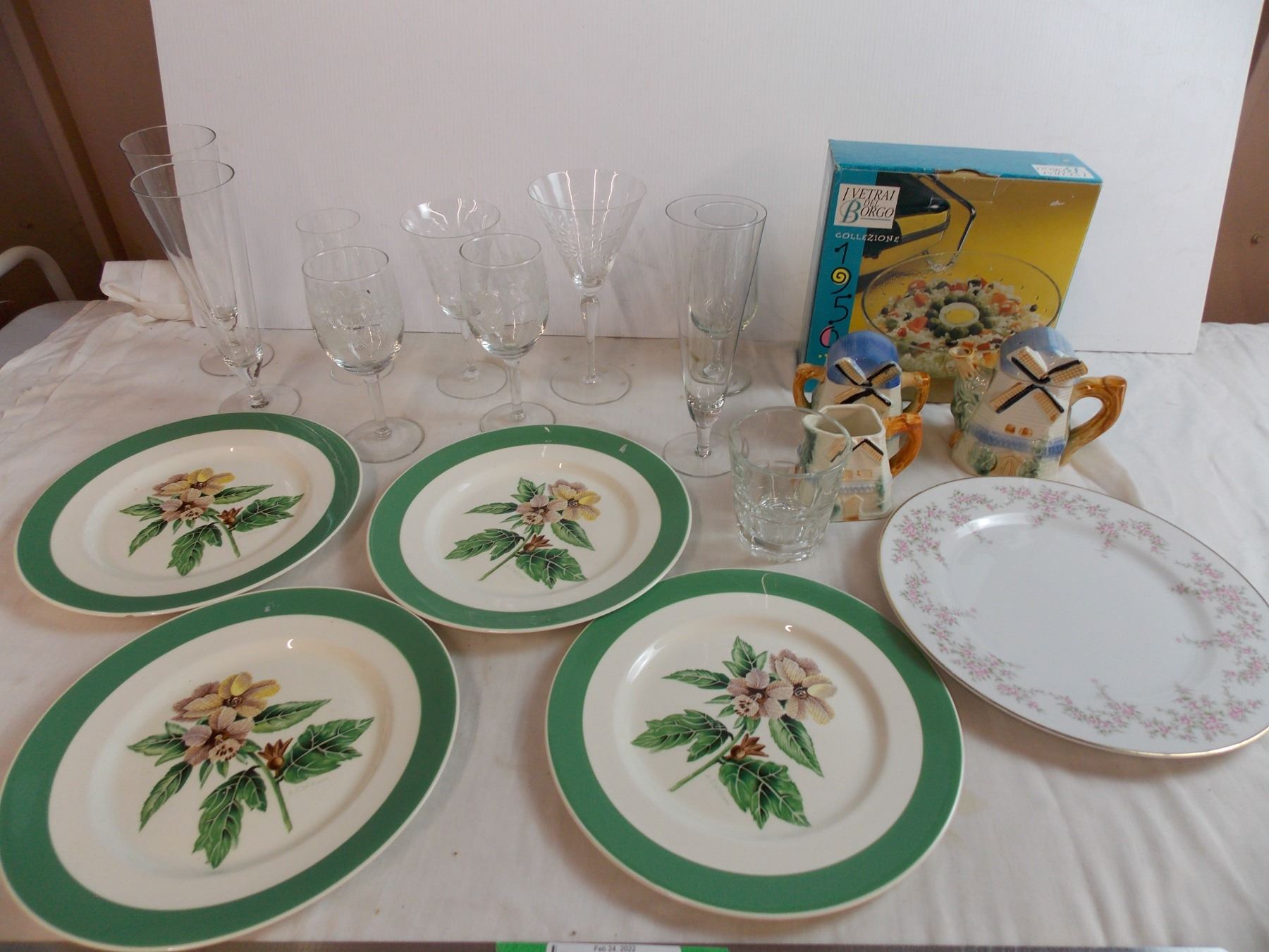 Household wine glasses, plates, serving bowl, ceramic teapot, cream + sugar set