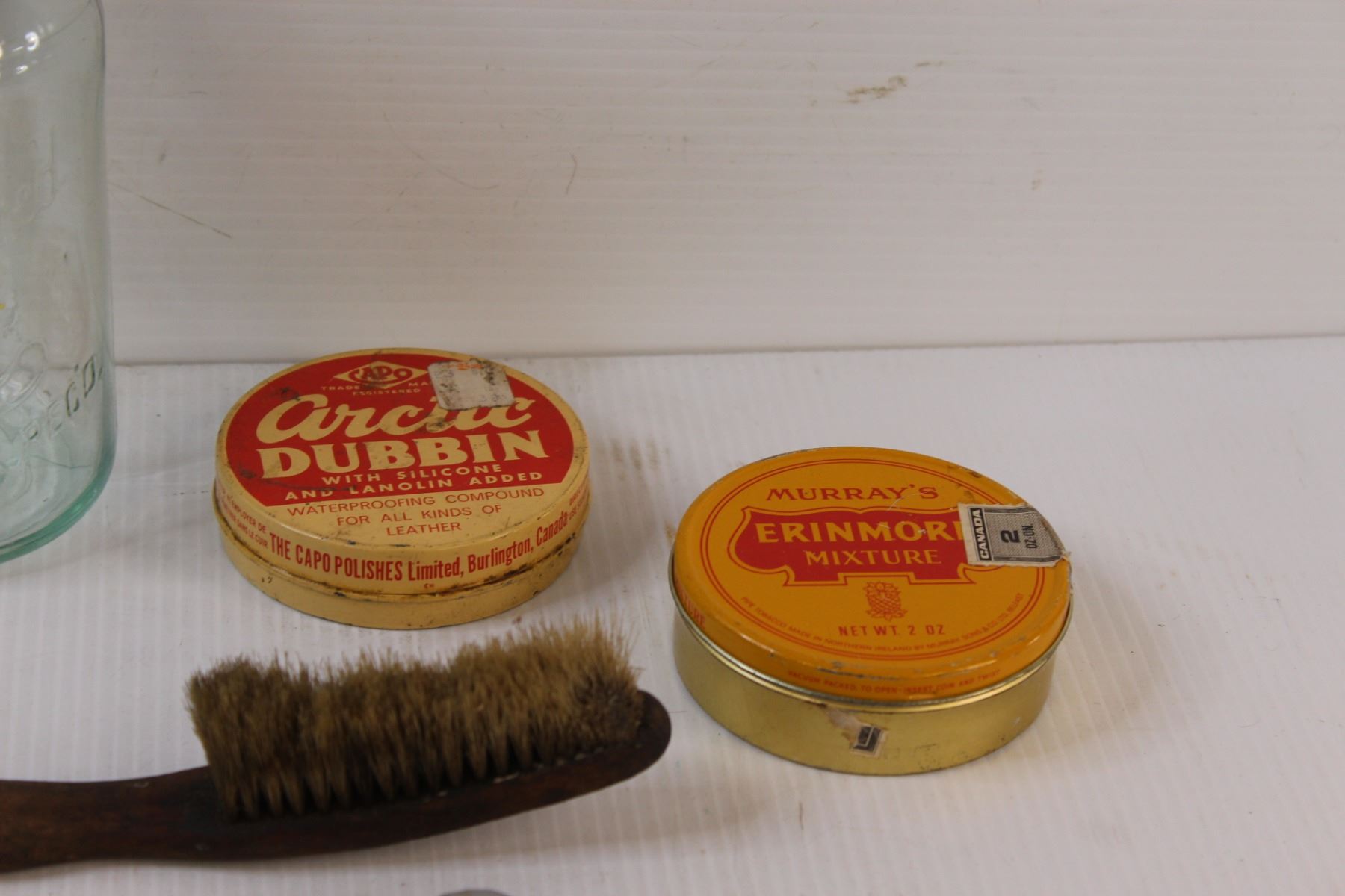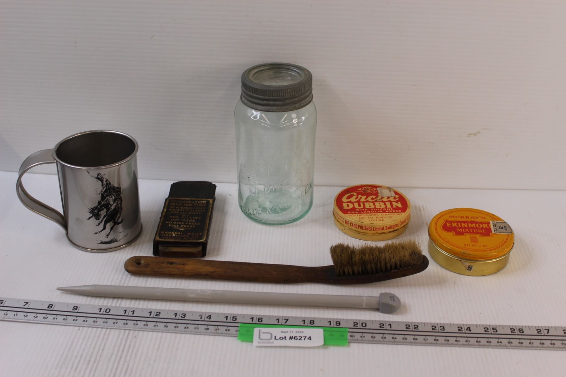 Imperial Gem Glass Jar, (2) Leather Protectant Jars, Leather Brush, Knitting Needle, Misc.