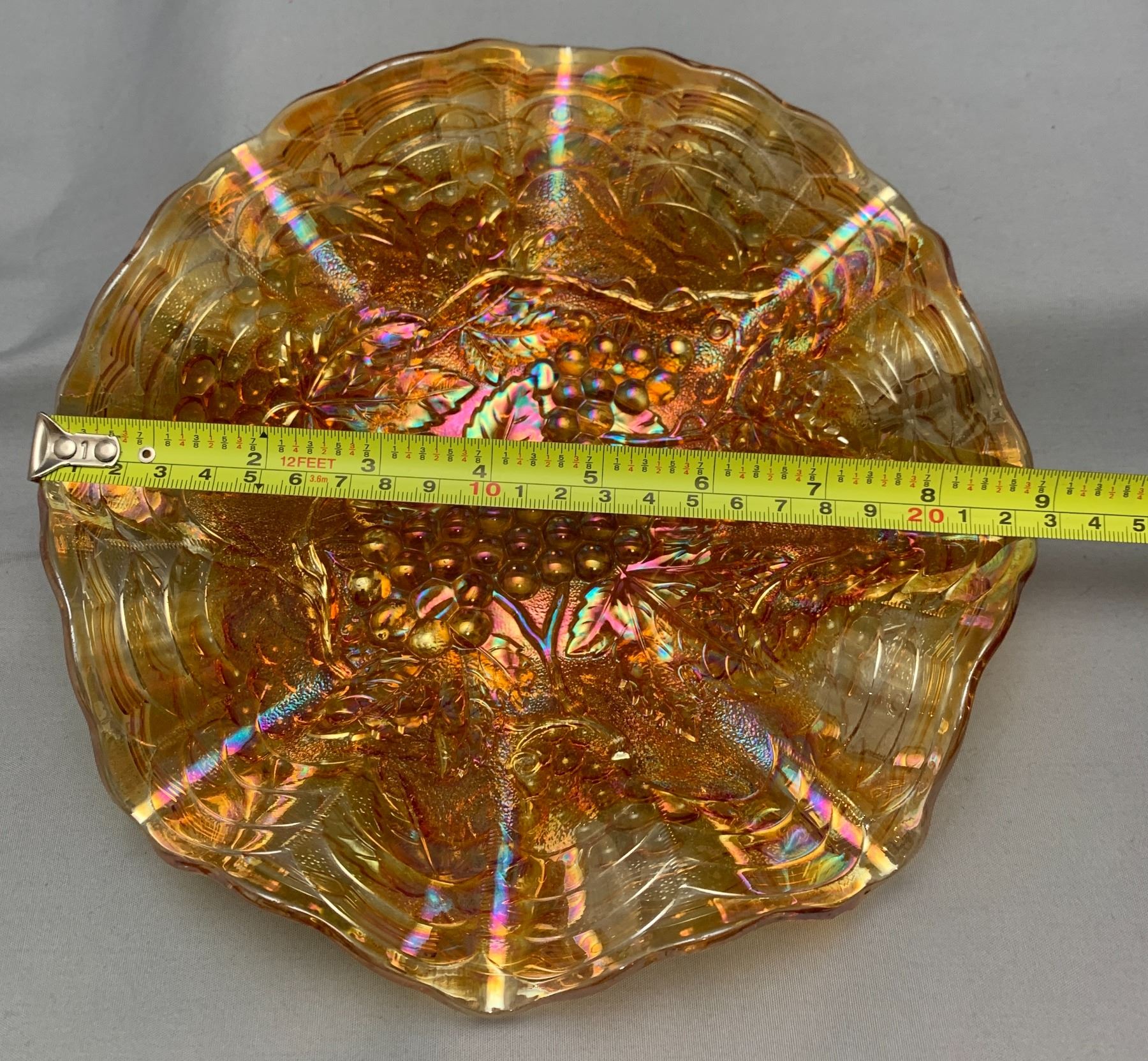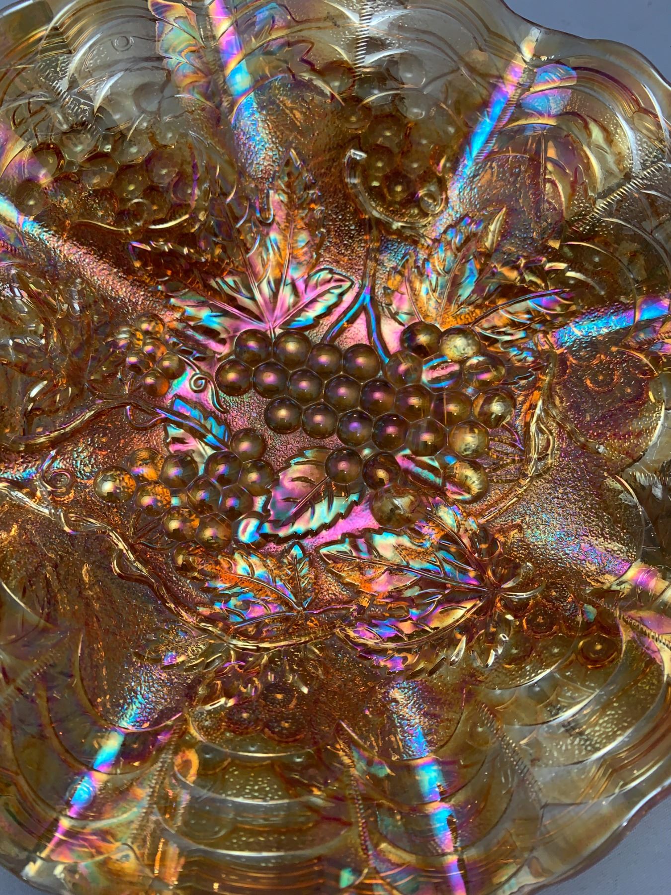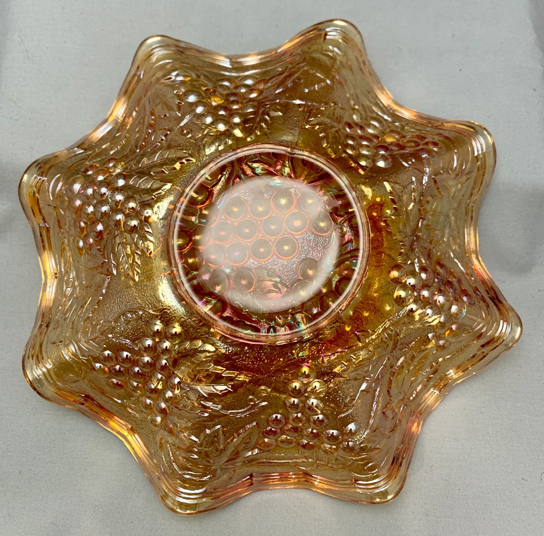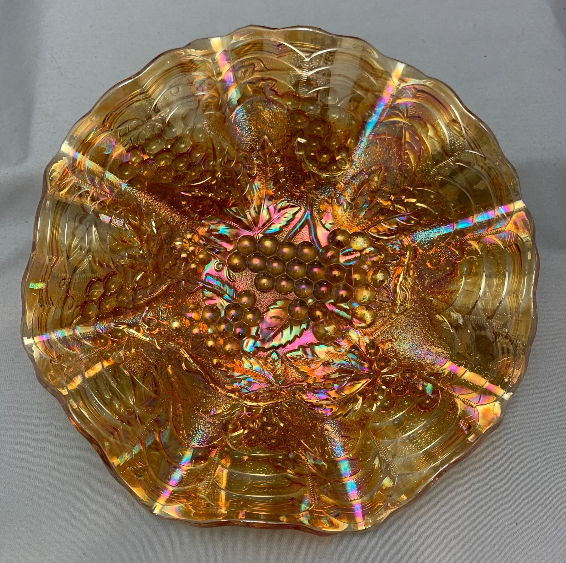 Imperial Glass CO. Radium Marigold Carnival Glass "Grapes" Low ruffled Bowl. Circa 1910