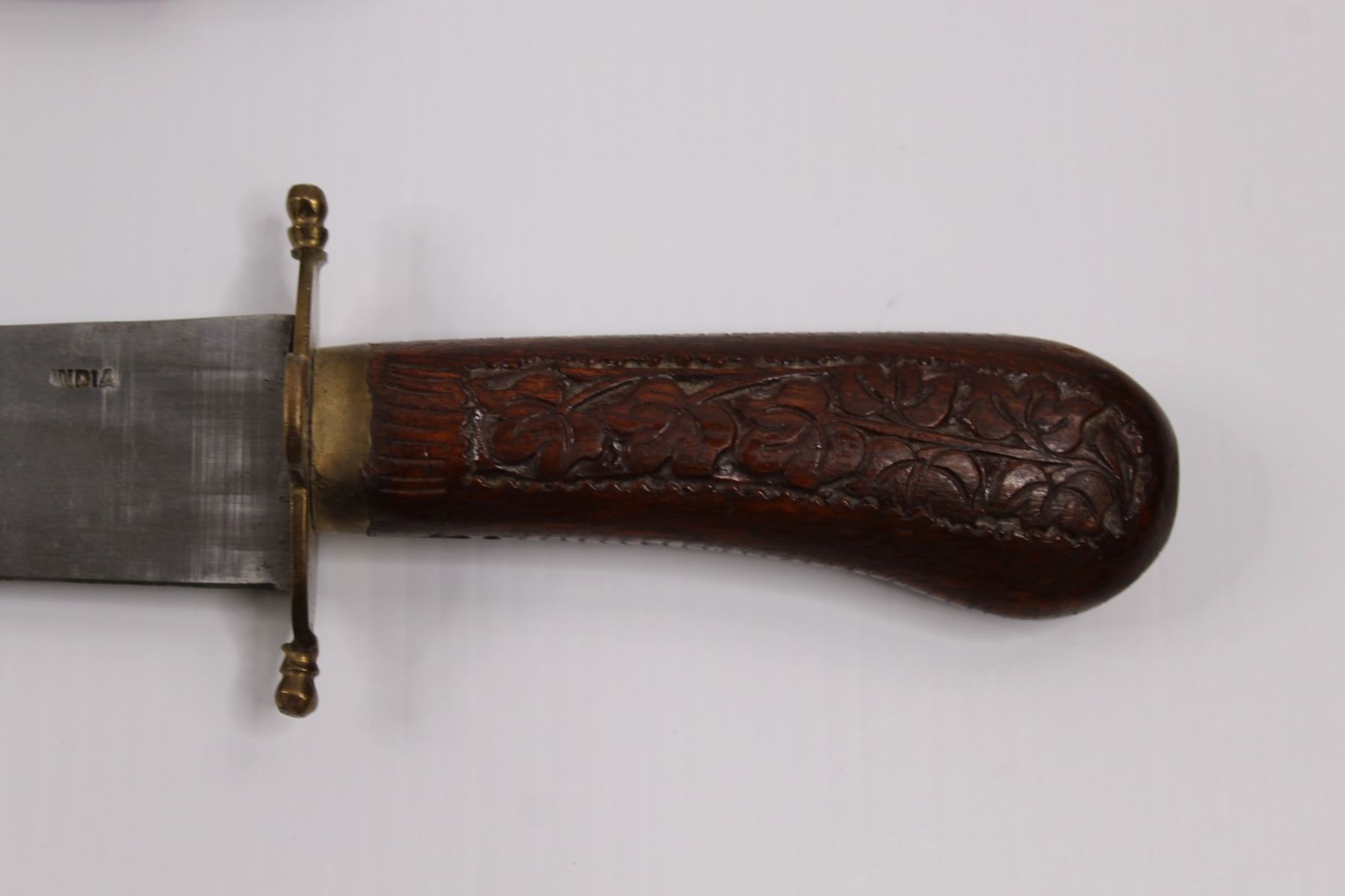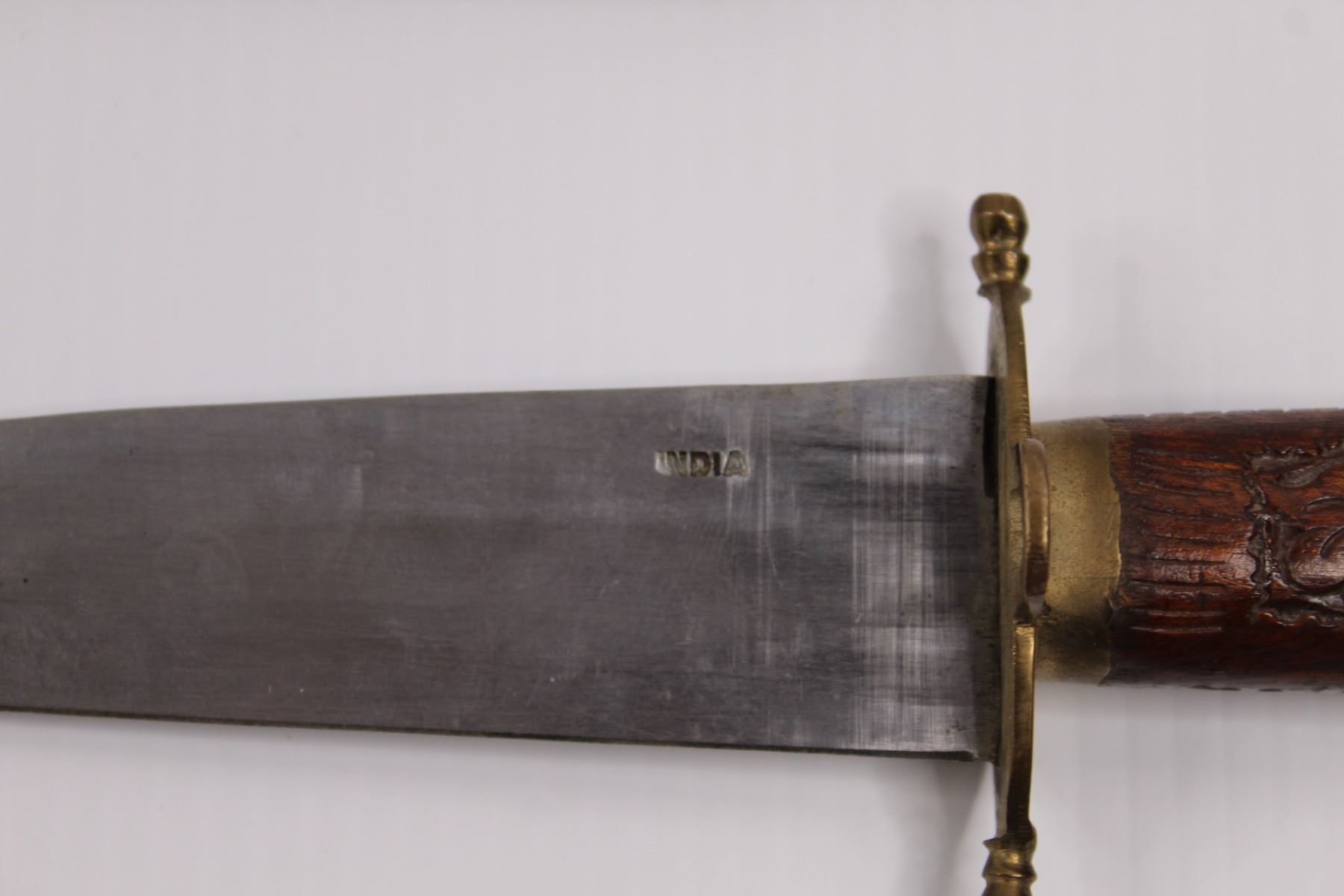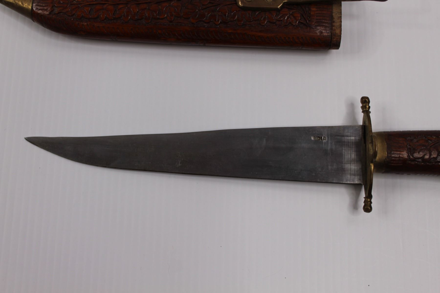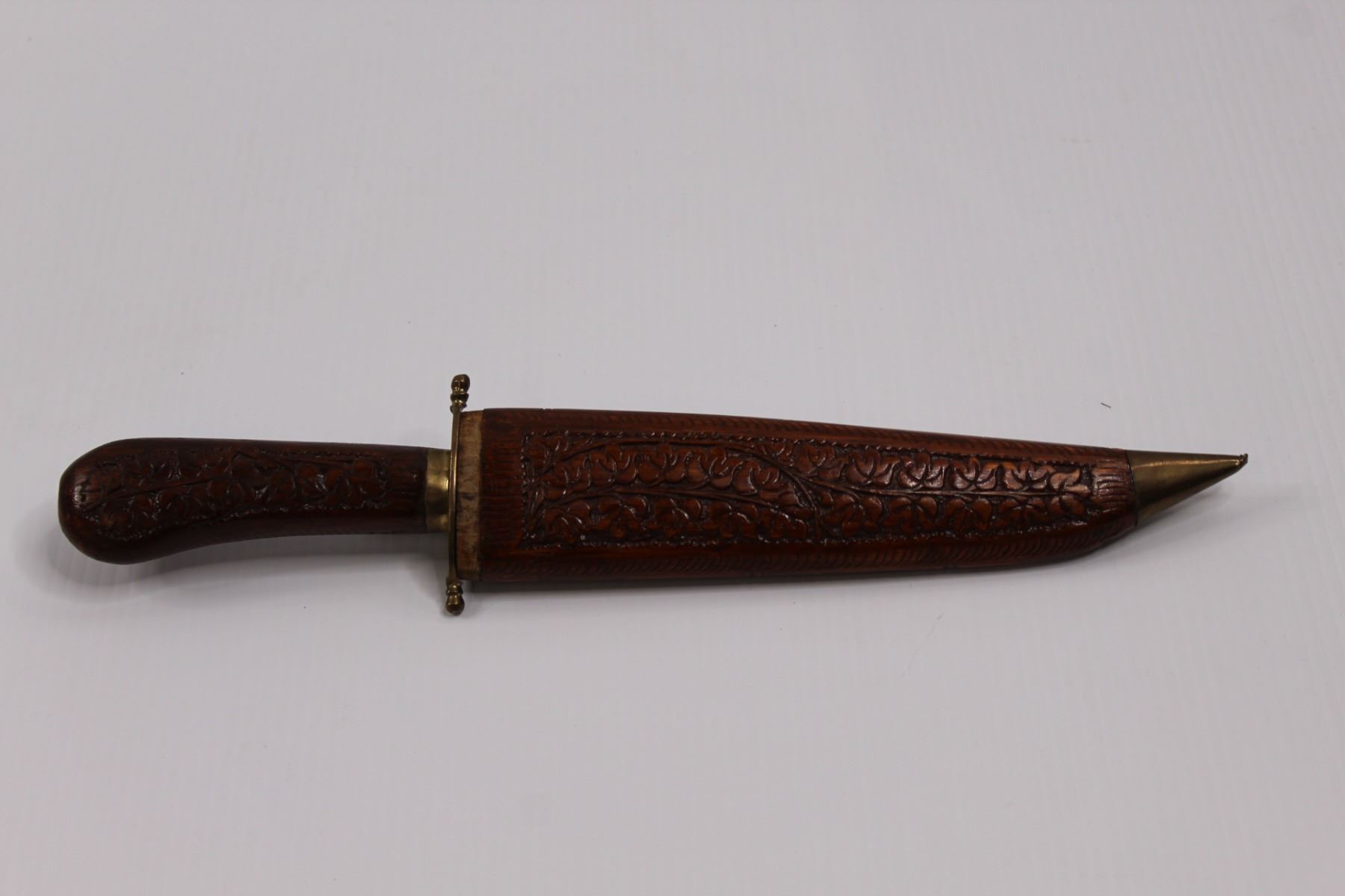 Indian Dagger w/Carved Wooden/Brass Handle & Carved Wood & Brass Sheath w/ Brass Pin Lock - Made in India
