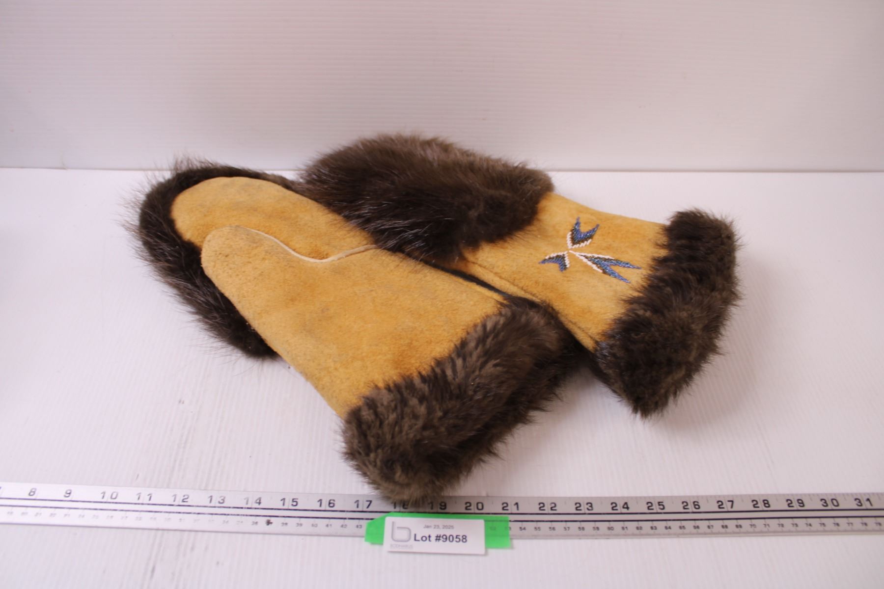 Indigenous Moose Hide & Beaver Fur Beaded Gauntlet Gloves - Consigner States Never Worn - 16" Length