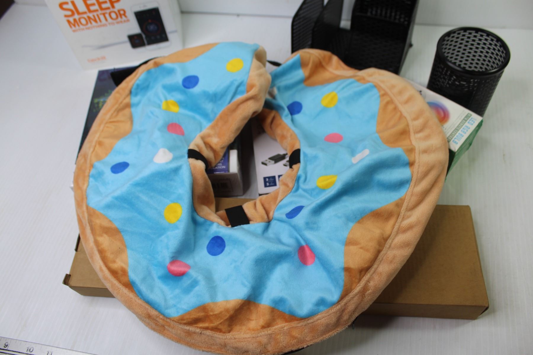 Inflatable Neck Support - Office Pen & Letter Holder - Medium Low TV Wall Mount - Calm 300 Piece Puzzle (NIB) - USB Mini Cable - Led Light Bulb - Sleep Monitor
